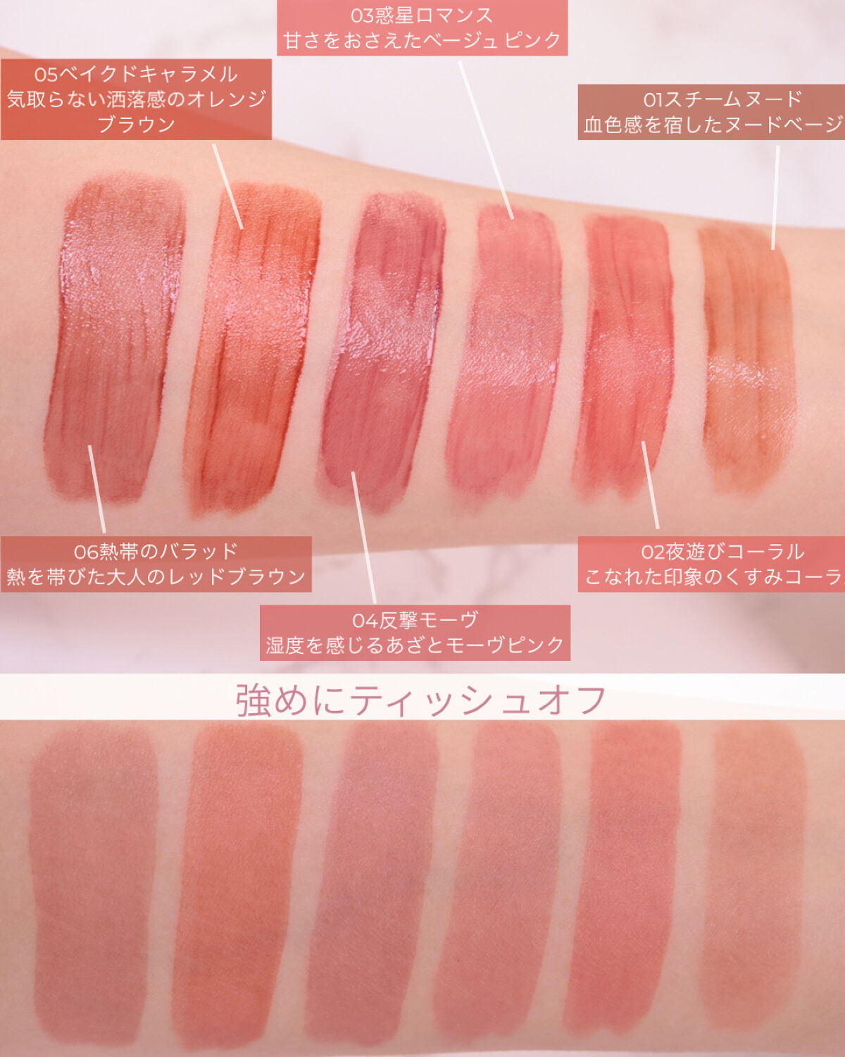 - 唇に色が密着し、ツヤのあるジェル膜でコートする新処方*1のティントリップ。 ジェル膜がリップコートのような役割をすることで、ティッシュオフをしなくてもマスクにつきにくく、まるでつけたてのような発色を長時間*2キープします。 水のようにさらっとした使い心地と色持ちを両立したウォーターティント処方。 ヒアルロン酸・コラーゲン・カモミラエキス配合(すべてうるおい成分) *1当社リップ製品において *2当社調べ。日中の活動時間 新色10~14 2024/08/28 先行発売 2024/10/01 全国発売