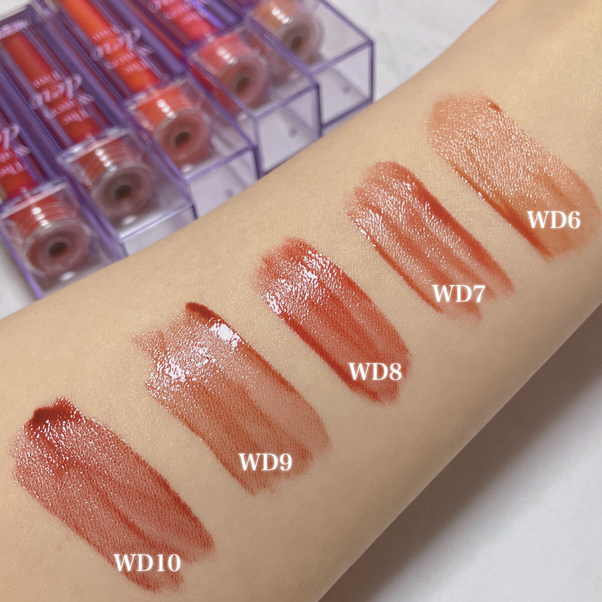 - <WD2 ビトゥン ローズ> 水、ジフェニルジメチコン、リンゴ酸ジイソステアリル、ビスジグリセリルポリアシルアジペート-2、水添ポリイソブテン、ジグリセリン、DPG、セチルPEG/PPG-10/1ジメチコン、イソステアリン酸ソルビタン、ポリソルベート60、ペンチレングリコール、オクチルドデカノール、セテアレス-20、(アクリル酸ヒドロキシエチル/アクリロイルジメチルタウリンNa)コポリマー、スクワラン、フェノキシエタノール、ポリグリセリン-3、ステビオシド、香料、エチルヘキシルグリセリン、グリセリン、シア脂、ツバキ種子油、トリ(カプリル酸/カプリン酸)グリセリル、アルガニアスピノサ核油、ホホバ種子油、アーモンド油、アンズ核油、月見草油、オリーブ果実油、テトラ(ジ-t-ブチルヒドロキシヒドロケイヒ酸)ペンタエリスリチル、カニナバラ果実エキス、マンゴー果実エキス、赤104(1)、赤227、黄5、青1 <WD3 ピンク ヘイズ> 水、ジフェニルジメチコン、リンゴ酸ジイソステアリル、ビスジグリセリルポリアシルアジペート-2、水添ポリイソブテン、ジグリセリン、DPG、セチルPEG/PPG-10/1ジメチコン、イソステアリン酸ソルビタン、ポリソルベート60、ペンチレングリコール、オクチルドデカノール、セテアレス-20、(アクリル酸ヒドロキシエチル/アクリロイルジメチルタウリンNa)コポリマー、スクワラン、フェノキシエタノール、ポリグリセリン-3、ステビオシド、香料、エチルヘキシルグリセリン、グリセリン、水酸化Al、ポリアクリル酸アンモニウム、BG、アルガニアスピノサ核油、シア脂、ツバキ種子油、トリ(カプリル酸/カプリン酸)グリセリル、アーモンド油、アンズ核油、ホホバ種子油、月見草油、オリーブ果実油、テトラ(ジ-t-ブチルヒドロキシヒドロケイヒ酸)ペンタエリスリチル、マンゴー果実エキス、カニナバラ果実エキス、酸化チタン、赤104(1)、赤227、黄5、青1 <WD4 オールウェイズ ヤング> 水、ジフェニルジメチコン、リンゴ酸ジイソステアリル、ビスジグリセリルポリアシルアジペート-2、水添ポリイソブテン、ジグリセリン、DPG、セチルPEG/PPG-10/1ジメチコン、イソステアリン酸ソルビタン、ポリソルベート60、ペンチレングリコール、オクチルドデカノール、セテアレス-20、(アクリル酸ヒドロキシエチル/アクリロイルジメチルタウリンNa)コポリマー、スクワラン、フェノキシエタノール、ポリグリセリン-3、ステビオシド、香料、エチルヘキシルグリセリン、グリセリン、シア脂、ツバキ種子油、トリ(カプリル酸/カプリン酸)グリセリル、アルガニアスピノサ核油、ホホバ種子油、アーモンド油、アンズ核油、月見草油、オリーブ果実油、テトラ(ジ-t-ブチルヒドロキシヒドロケイヒ酸)ペンタエリスリチル、カニナバラ果実エキス、マンゴー果実エキス、赤104(1)、赤227、黄5、青1 <WD6 クラッシュド パンプキン> 水、水添ポリイソブテン、リンゴ酸ジイソステアリル、ビスジグリセリルポリアシルアジペート-2、ジフェニルシロキシフェニルトリメチコン、ジフェニルジメチコン、ポリグリセリン-3、オクチルドデカノール、ポリソルベート60、セチルPEG/PPG-10/1ジメチコン、ラウリン酸ポリグリセリル-10、ペンチレングリコール、1,2-ヘキサンジオール、(アクリル酸ヒドロキシエチル/アクリロイルジメチルタウリンNa)コポリマー、PEG-60水添ヒマシ油、セテアリルアルコール、スクワラン、キシリトール、エチルヘキシルグリセリン、香料、ポリアクリル酸アンモニウム、イソステアリン酸ソルビタン、水酸化Al、フェノキシエタノール、BG、トコフェロール、酸化チタン、酸化鉄、赤227、黄4、黄5、青1 <WD8 ビンテージ カラント> 水、水添ポリイソブテン、リンゴ酸ジイソステアリル、ビスジグリセリルポリアシルアジペート-2、ジフェニルシロキシフェニルトリメチコン、ジフェニルジメチコン、オクチルドデカノール、ポリグリセリン-3、ポリソルベート60、セチルPEG/PPG-10/1ジメチコン、ラウリン酸ポリグリセリル-10、1,2-ヘキサンジオール、ペンチレングリコール、(アクリル酸ヒドロキシエチル/アクリロイルジメチルタウリンNa)コポリマー、PEG-60水添ヒマシ油、セテアリルアルコール、スクワラン、キシリトール、エチルヘキシルグリセリン、香料、イソステアリン酸ソルビタン、トコフェロール、赤104(1)、赤227、黄5、青1 <WD9 ミスター ストレンジャー> 水、水添ポリイソブテン、リンゴ酸ジイソステアリル、ビスジグリセリルポリアシルアジペート-2、ジフェニルシロキシフェニルトリメチコン、ジフェニルジメチコン、オクチルドデカノール、ポリグリセリン-3、ポリソルベート60、セチルPEG/PPG-10/1ジメチコン、ラウリン酸ポリグリセリル-10、1,2-ヘキサンジオール、ペンチレングリコール、(アクリル酸ヒドロキシエチル/アクリロイルジメチルタウリンNa)コポリマー、セテアリルアルコール、PEG-60水添ヒマシ油、スクワラン、キシリトール、エチルヘキシルグリセリン、香料、イソステアリン酸ソルビタン、水酸化Al、ポ