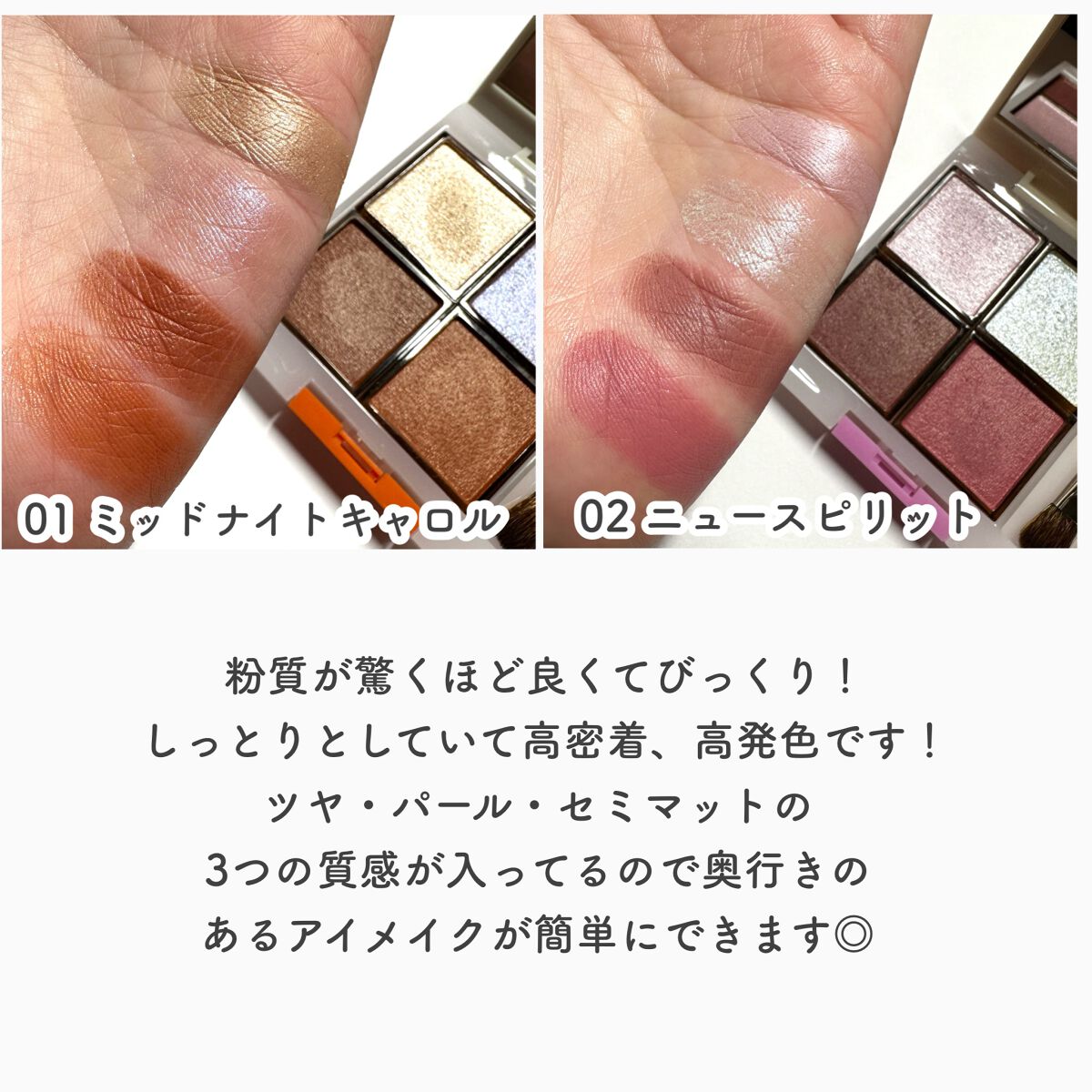 - 色も、質感も、きらめきも。毎日お気に入りの目元を作れる4 色パレットシャドウ 1.様々な色や質感、きらめきを組み合わせて楽しめます。 2.重ねても美しく濁りのないクリアな発色です。 3.まぶたにピタッと密着して粉飛びやヨレを防ぐフィットオイル*1配合。 4.デリケートなまぶたのためのスクワラン*2配合。 <デザイン> ・色調整しやすいオリジナルチップ&ブラシ しっかり発色させたいときにはチップ、ふんわりぼかしたいときにはブラシを。 お好みに合わせてお使いいただけます。 ・ 持ち運びに便利な鏡付き ・ この冬だけの限定デザイン パーティーの華やかさを想起させるカジュアルアートをあしらった開放感あふれるポジティブなデザインです。 *1 リンゴ酸ジイソステアリル *2 保湿成分