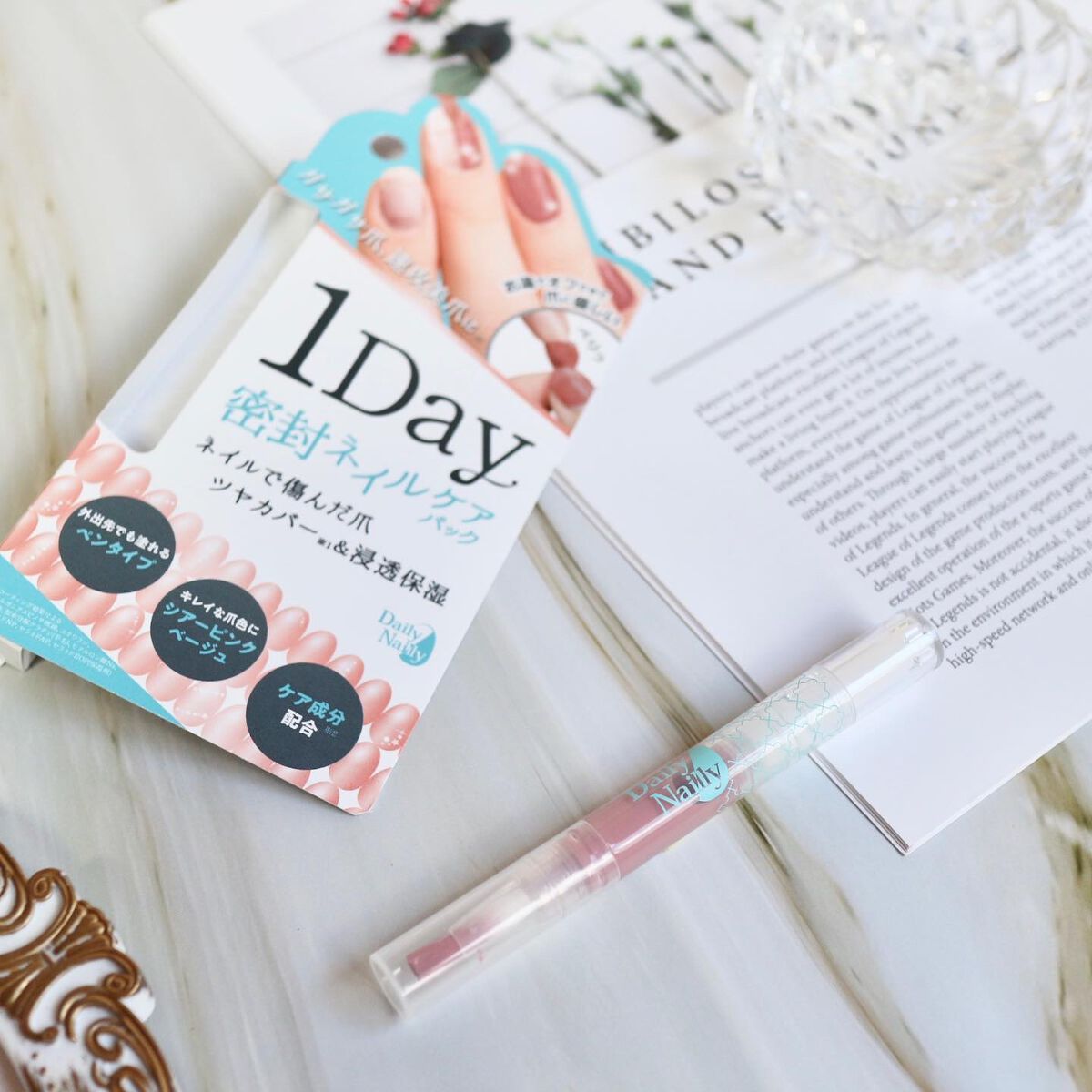 外出先でも塗れるペンタイプ ネイルで傷んだ爪や アルコール等で乾燥した爪を 瞬時にツヤのある美爪に👀✨ そんな時にも使える ペンタイプ😊👍🏻 ツヤのあるシアーピンクベージュ ケラチン※2やスクワラン※3などの 補修美爪成分配合 お風呂に入っていたら自然と剥がれました🛁 本当に1Dayだけのネイル🌷 不器用な私でもサッと塗れたので 気になった時にすぐに使えて、便利☃️