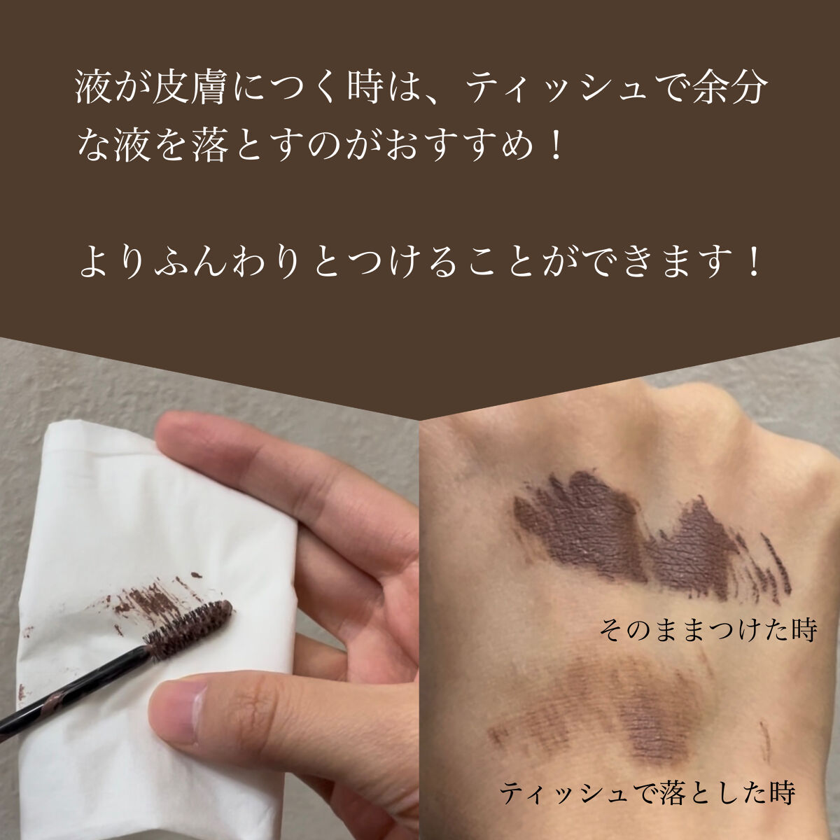 - ひと塗りでしっかり眉色チェンジ!!高発色眉マスカラ 髪色に合わせて、眉だけ浮いた感じをなくして一気にあか抜け顔に! 眉色を明るくすることで透明感のある肌にみせ、やさしい印象に仕上がります。 地肌につきにくい濃密ブラシが1本1本しっかりコーティングし、 毛流れを整えてキレイな眉をキープ!