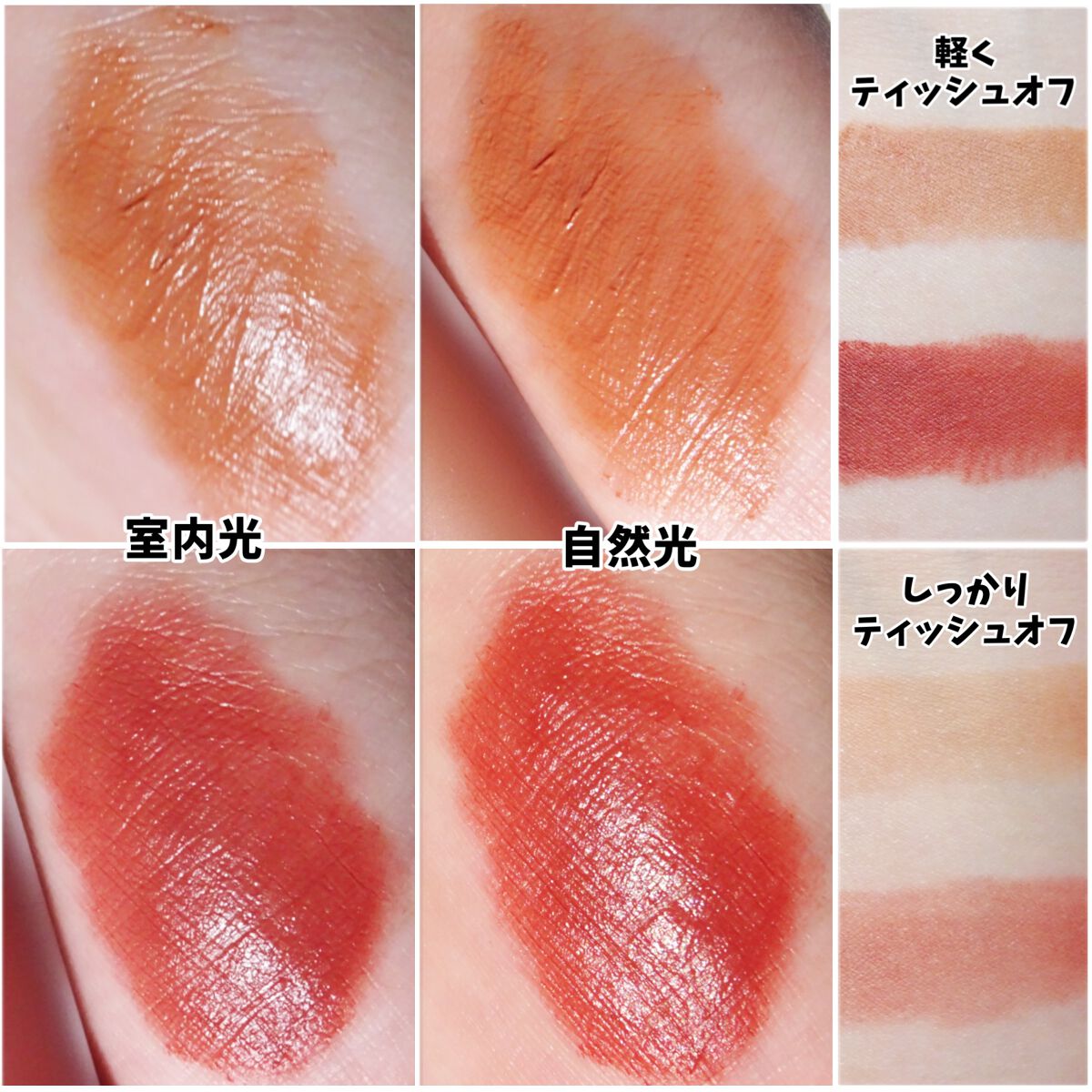 デパコス級の濃密カラーと上品なツヤがプチプラで買える🥀 ややオレンジっぽさを感じるローズレッド 可愛すぎないピンクカラー ほんのりくすみもある絶妙なカラー💕 明るすぎない、まろやかなラベンダーピンク ややくすみのあるヌーディーピンクベージュ 流れる血のようなダークローズレッド 唇に乗せてみるとそこまで深くなくて使いやすい◎ 最後の動画でもあるように、しっかりした発色なのにティッシュオフしても落ちにくい🙆♀️✨ 蛍光化せず、付けたてのカラーが長持ち💕 落ち方が均一で、汚くならないのも嬉しいですよね このリップが好きな理由の1つは『香り』 お花のような香りが大好き🌷