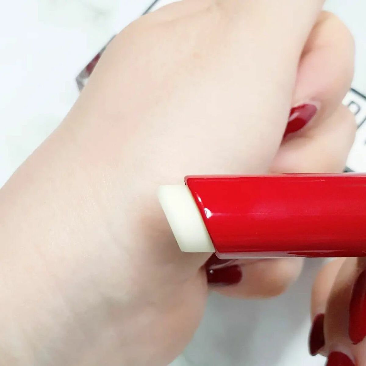 硬めのテクスチャーでチューブを強く押さないと出てきません🤣笑 米粒1粒程度という極小量で、両目の上下まぶたが十分に塗れます❗ 色は少し白っぽいですが気になるほどでもなく、ウォータープルーフ処方ですが夕方になっても乾燥せず、持ちも良かったです👍❤️ 二重幅にアイシャドウが溜まることもなかったです‼ 550円って考えたら破格😳 かなり能力の高いアイシャドウベースだと思います🧡