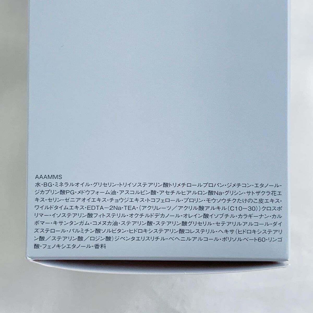 - <110g> 水、BG、ミネラルオイル、グリセリン、トリイソステアリン酸トリメチロールプロパン、ジメチコン、メドウフォーム油、エタノール、ジカプリン酸PG、アーモンド油、アスコルビン酸、アセチルヒアルロン酸Na、グリシン、サトザクラ花エキス、セリン、ゼニアオイエキス、トコフェロール、プロリン、モウソウチクたけのこ皮エキス、ワイルドタイムエキス、EDTA-2Na、TEA、(アクリル酸Na/アクリロイルジメチルタウリンNa)コポリマー、(アクリレーツ/アクリル酸アルキル(C10-30))クロスポリマー、イソヘキサデカン、オクチルドデカノール、オレイン酸イソブチル、オレイン酸ソルビタン、オレイン酸フィトステリル、カラギーナン、キサンタンガム、ステアリン酸、ステアリン酸グリセリル、セテアリルアルコール、セラミドNG、パルミチン酸ソルビタン、ヒドロキシステアリン酸コレステリル、ヘキサ(ヒドロキシステアリン酸/ステアリン酸/ロジン酸)ジペンタエリスリチル、ベヘニルアルコール、ポリソルベート60、ポリソルベート80、リンゴ酸、フェノキシエタノール、香料 <200g> 水、BG、ミネラルオイル、グリセリン、トリイソステアリン酸トリメチロールプロパン、ジメチコン、メドウフォーム油、エタノール、ジカプリン酸PG、アーモンド油、アスコルビン酸、アセチルヒアルロン酸Na、グリシン、サトザクラ花エキス、セリン、ゼニアオイエキス、トコフェロール、プロリン、モウソウチクたけのこ皮エキス、ワイルドタイムエキス、EDTA-2Na、TEA、(アクリル酸Na/アクリロイルジメチルタウリンNa)コポリマー、(アクリレーツ/アクリル酸アルキル(C10-30))クロスポリマー、イソヘキサデカン、オクチルドデカノール、オレイン酸イソブチル、オレイン酸ソルビタン、オレイン酸フィトステリル、カラギーナン、キサンタンガム、ステアリン酸、ステアリン酸グリセリル、セテアリルアルコール、セラミドNG、パルミチン酸ソルビタン、ヒドロキシステアリン酸コレステリル、ヘキサ(ヒドロキシステアリン酸/ステアリン酸/ロジン酸)ジペンタエリスリチル、ベヘニルアルコール、ポリソルベート60、ポリソルベート80、リンゴ酸、フェノキシエタノール、香料