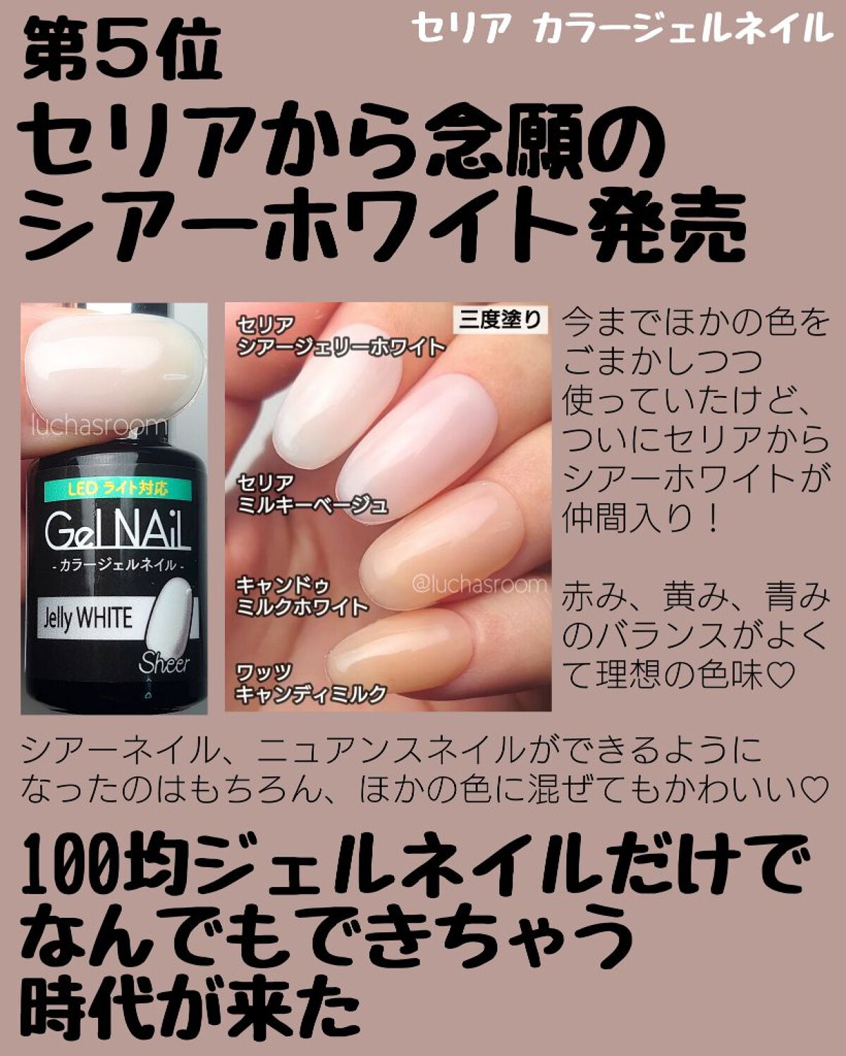 | ネイルランキング第102位 | シアーなので抜け感+透明感がすごい 爪が綺麗だと肌まで明るく綺麗に見える | 詳細を見る |