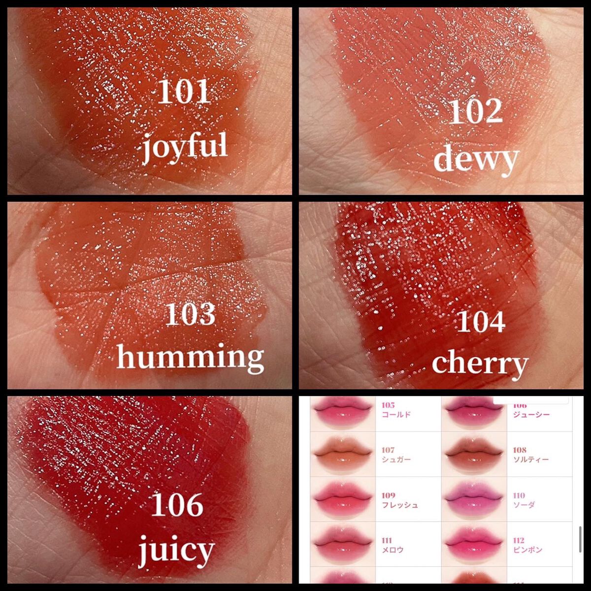 - <101 ジョイフル> 水、リンゴ酸ジイソステアリル、ダイマージリノール酸(フィトステリル/イソステアリル/セチル/ステアリル/ベヘニル)、ジイソステアリン酸ダイマージリノレイル、ノナイソステアリン酸ポリグリセリル-10、オクチルドデカノール、ビスジグリセリルポリアシルアジペート-2、水添ポリイソブテン、セチルPEG/PPG-10/1ジメチコン、ポリソルベート60(小麦由来)、イソステアリン酸ソルビタン(小麦由来)、1,2-ヘキサンジオール、グリセリン、ベヘニルアルコール、(アクリル酸/MA)コポリマーNa、ペンチレングリコール、BG、ポリアクリレート-13、トロメタミン、(アクリレーツ/アクリル酸アルキ ル(C10-30 )クロスポリマー、エチルヘキシルグリセリン、ポリイソブテン、(アクリル酸ヒドロキシエチル/アクリロイルジメチルタウリンNa)コポリマー、スクワラン、デヒドロ酢酸、ステビオシド、香料、フィチン酸、カプリリルグリコール、ジメチコン、水添ロジン酸メチル、水酸化Al、ポリソルベート20(小麦由来)、トコフェロール、ライム果汁、キイチゴ果汁、レモン果汁、マンゴー果汁、フラガリアチロエンシス果汁、アンズ果汁、オレンジ果汁、グレープフルーツ液汁、キウイ果汁、パパイア果汁、[+/-]酸化チタン、黄4、黄5、赤 104(1)、赤227、青1 <102 デューイ> 水、リンゴ酸ジイソステアリル、ダイマージリノール酸(フィトステリル/イソステアリル/セチル/ステアリル/ベヘニル)、ジイソステアリン酸ダイマージリノレイル、ノナイソステアリン酸ポリグリセリル-10、オクチルドデカノール、ビスジグリセリルポリアシルアジペート-2、水添ポリイソブテン、セチルPEG/PPG-10/1ジメチコン、ポリソルベート60(小麦由来)、イソステアリン酸ソルビタン(小麦由来)、1,2-ヘキサンジオール、グリセリン、ベヘニルアルコール、(アクリル酸/MA)コポリマーNa、ペンチレングリコール、BG、ポリアクリレート-13、トロメタミン、(アクリレーツ/アクリル酸アルキル(C10-30))クロスポリマー、エチルヘキシルグリセリン、ポリイソブテン、(アクリル酸ヒドロキシエチル/アクリロイルジメチルタウリンNa)コポリマー、スクワラン、デヒドロ酢酸、ステビオシド、香料、フィチン酸、ジメチコン、水添ロジン酸メチル、水酸化Al、カプリリルグリコール、ポリソルベート20(小麦由来)、トコフェロール、ライム果汁、キイチゴ果汁、レモン果汁、マンゴー果汁、フラガリアチロエンシス果汁、アンズ果汁、オレンジ果汁、グレープフルーツ液汁、キウイ果汁、パパイア果汁、酸化チタン、赤227、黄5、黄4、青1 <103 ハミング> 水、リンゴ酸ジイソステアリル、ダイマージリノール酸(フィトステリル/イソステアリル/セチル/ステアリル/ベヘニル)、ジイソステアリン酸ダイマージリノレイル、ノナイソステアリン酸ポリグリセリル-10、オクチルドデカノール、ビスジグリセリルポリアシルアジペート-2、水添ポリイソブテン、セチルPEG/PPG-10/1ジメチコン、ポリソルベート60(小麦由来)、イソステアリン酸ソルビタン(小麦由来)、1,2-ヘキサンジオール、グリセリン、ベヘニルアルコール、(アクリル酸/MA)コポリマーNa、ペンチレングリコール、BG、ポリアクリレート-13、トロメタミン、(アクリレーツ/アクリル酸アルキル(C10-30))クロスポリマー、エチルヘキシルグリセリン、ポリイソブテン、(アクリル酸ヒドロキシエチル/アクリロイルジメチルタウリンNa)コポリマー、スクワラン、デヒドロ酢酸、ステビオシド、香料、フィチン酸、ジメチコン、水添ロジン酸メチル、水酸化Al、カプリリルグリコール、ポリソルベート20(小麦由来)、トコフェロール、ライム果汁、キイチゴ果汁、レモン果汁、マンゴー果汁、フラガリアチロエンシス果汁、アンズ果汁、オレンジ果汁、グレープフルーツ液汁、キウイ果汁、パパイア果汁、酸化チタン、黄5、赤227、青1 <104 チェリー> 水、リンゴ酸ジイソステアリル、ダイマージリノール酸(フィトステリル/イソステアリル/セチル/ステアリル/ベヘニル)、ジイソステアリン酸ダイマージリノレイル、ノナイソステアリン酸ポリグリセリル-10、オクチルドデカノール、ビスジグリセリルポリアシルアジペート-2、水添ポリイソブテン、セチルPEG/PPG- 10/1ジメチコン、イソステアリン酸ソルビタン(小麦由来)、ポリソルベート60(小麦由来)、1,2-ヘキサンジオール、グリセリン、ベヘニルアルコール、(アクリル酸/MA)コポリマーNa、ペンチレングリコール、BG、ポリアクリレート-13、ト ロメタミン、(アクリレーツ/アクリル酸ア ルキル(C10-30))クロスポリマー、エチルヘキシルグリセリン、ポリイソブテ ン、(アクリル酸ヒドロキシエチル/アクリ ロイルジメチルタウリンNa)コポリマー、スクワラン、デヒドロ酢酸、ステビオシド、香料、カプリリルグリコール、ポリソルベー ト20(小麦由来)、トコフェロール、ライム果汁、キイチゴ果汁、レモン果汁、マンゴー 果汁、フラガリアチロエンシス果汁、アンズ 果汁、オレンジ果汁、グレープフルーツ液 汁、キウ