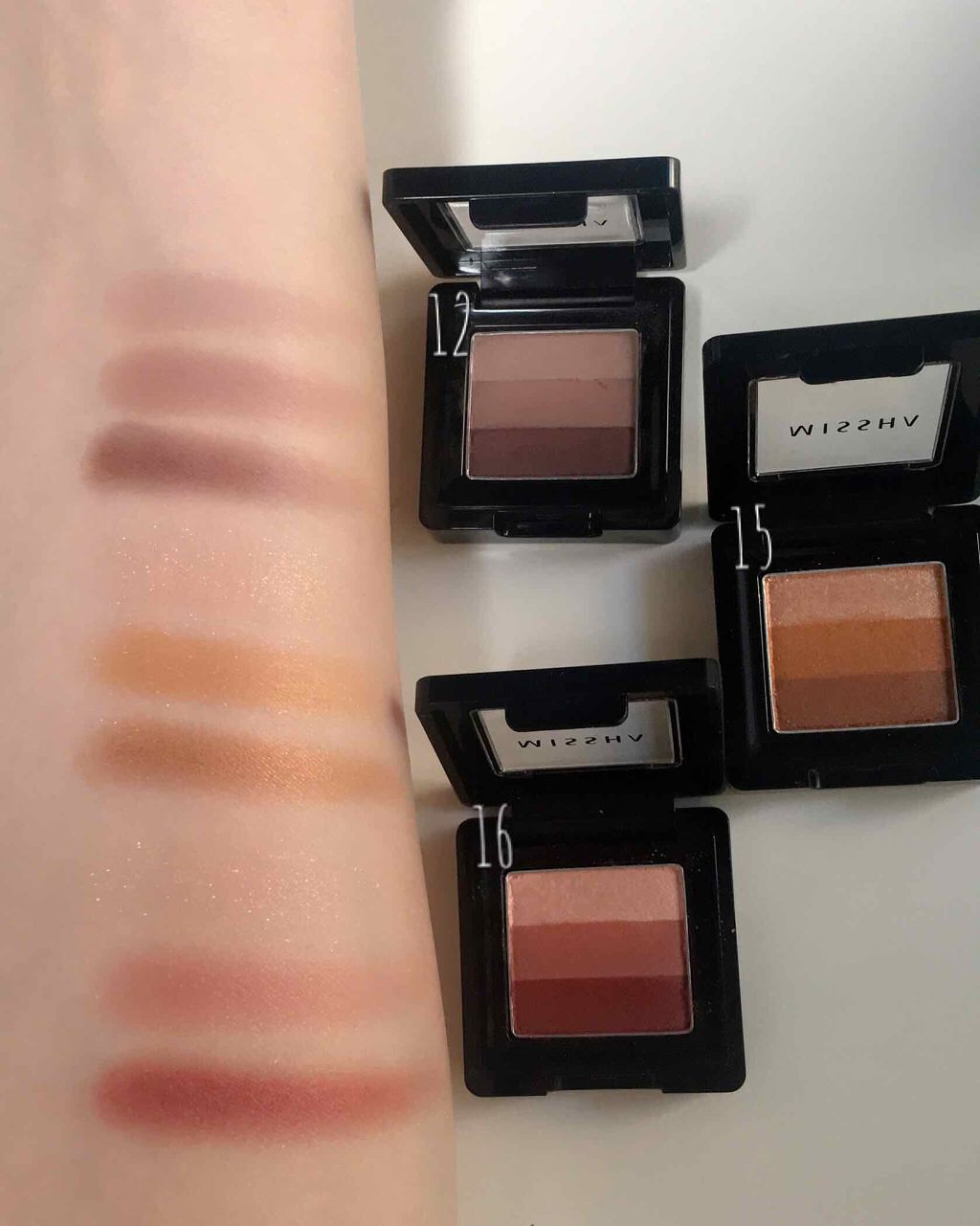 🌷MISSHAトリプルシャドウ私が持っているのは全部で9カラーです!カラーナンバーは写真の通り!全部で16色あります!同系色の色が3段に濃淡の順に配色されているので綺麗にグラデーションをつくることができますっ(*^^*)マットなものからツヤ感...
