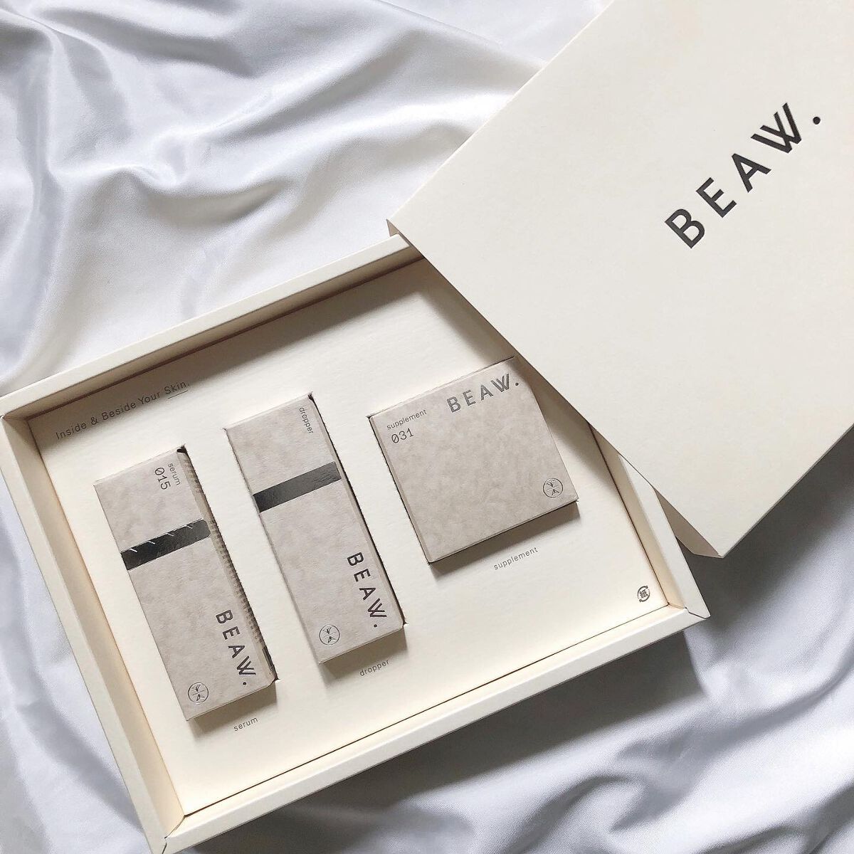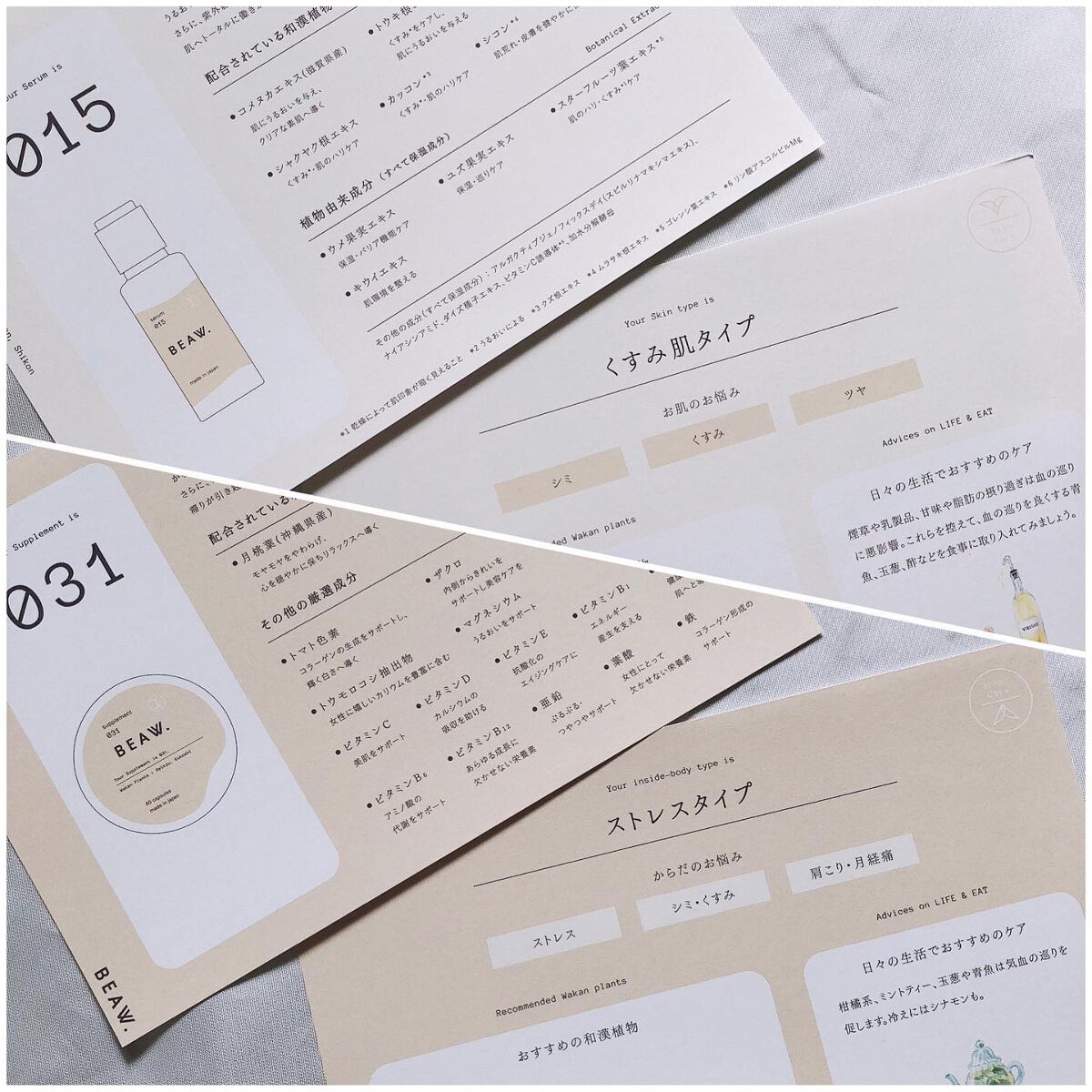 - ・BEAW.のパーソナライズケアは始めにパーソナライズ診断を行い、20種類の和漢と、自然由来の保湿成分の組み合わせから、一人ひとりに合わせた製品をお届けします。 ・現在の自分の悩みにぴったりのパーソナルケアキット、和漢植物由来成分を配合した2剤式のセラムとサプリメントのセットでお届けします。からだの内と外から同時に理想の美しさをめざせるデュアルケアで、あなたの美容をサポートします。 ・美容液は、肌荒れ予防、乾燥、毛穴、テカリ、くすみ*、年齢肌、ツヤ肌、などその人それぞれの悩みに対して適した処方で国産和漢植物成分と、植物エキス、ビタミンやセラミド、プラセンタ、ナイアシンアミド、などを配合した保湿成分を分析結果に合わせて配合。*乾燥による ・サプリメントは体の内側からキレイをサポートする国産和漢植物成分と20種類以上のビタミン、ミネラルをそれぞれに合わせて配合。 -対象商品- BEAW.リッチセラム003、008、015 BEAW.サプリメント:001、007、031 BEAW.フェイスウォッシュ:019、026、045 -内容量- BEAW.リッチセラム:30ml BEAW.サプリメント:60粒 BEAW.フェイスウォッシュ:80g