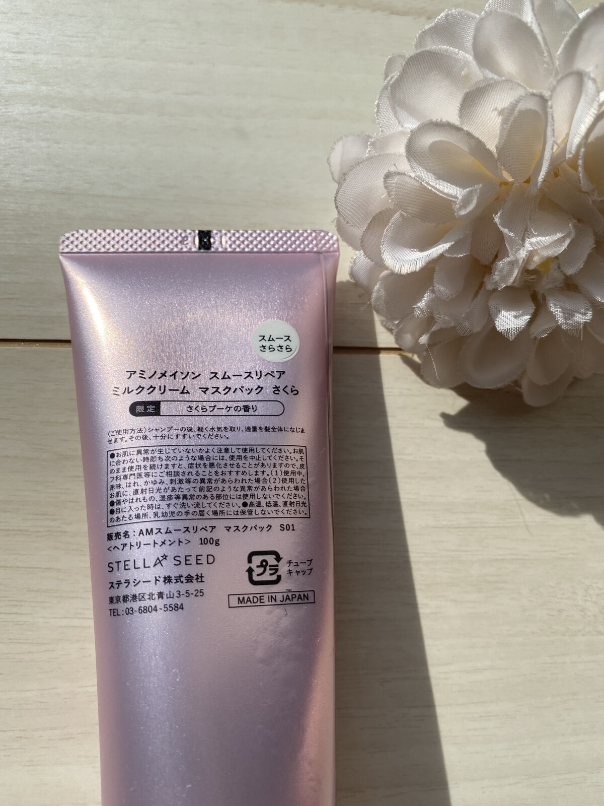 実際には桜餅のような香りがします🌸持続性は感じられてないです。 髪がキシキシせず、乾かした後はサラッとするのにまとまりも出ます🙌 マスクパックの方は裏面にシャンプーの後に使用すると書いてありましたが、実際にはトリートメントを使った後に使った方が効果を感じられました。 アミノメイソンは初めて使いましたが、普通の方も買ってみてもいいなと思えるぐらいには好きでした!✨
