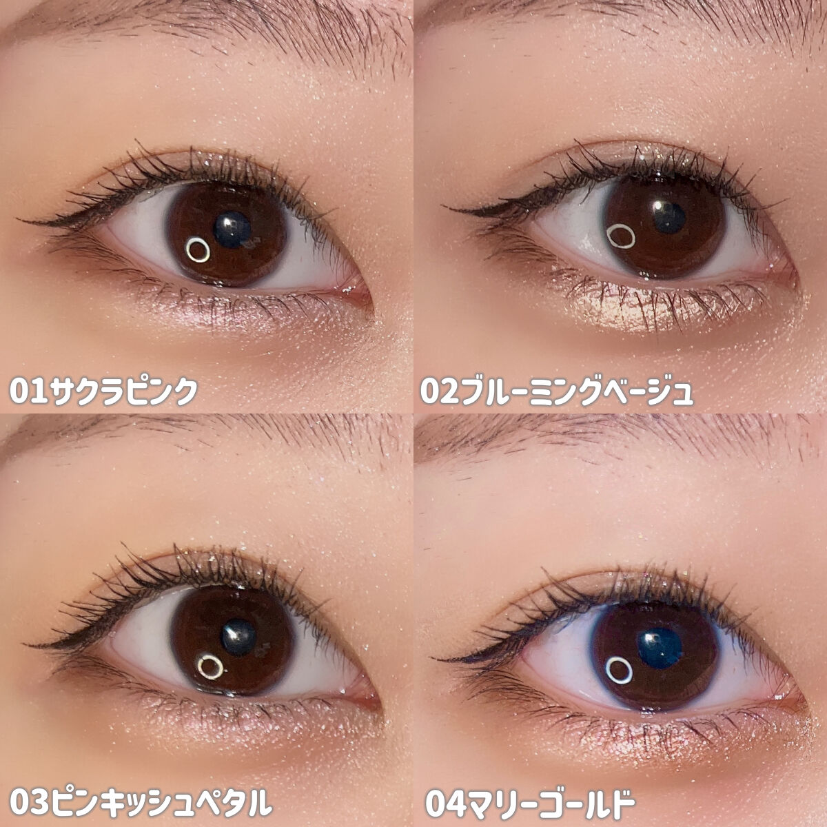 - <コンセプト> ぱっと花ひらくように咲かせよう、わたしの瞳 ~大きな瞳の小さな秘密~ <商品特徴>マルチに使えるパウダー&リキッド ●パウダー ①高輝度パールを贅沢に配合 01、02⇒8種のツヤパールin 03、04⇒13種のガラスパール&ツヤパールin ②独自のシルキーフィット処方 ・軽くのび広がり、ムラなく塗布しやすい ・密着力が高く、粉飛びが少ない ・ウォータープルーフ処方で汗、皮脂、水に強い ③7種の美容保湿成分を配合 ヒアルロン酸Na、水溶性コラーゲン、ローヤルゼリーエキス、ラベンダー花エキス、カミツレ花エキス、リンゴ果実エキス、トレハロース ●リキッド ①影をこっそり仕込む極細ショート筆 ・筆先が短く、しなりにくいから、ブレずに描きやすい ②マルチな使い方ができる ・涙袋の影、ふたえライン、まつ毛のキワ、切開ライン、ノーズシャドウ、人中短縮メイクなど使い方は無限大! ③ウォータープルーフ処方で汗、皮脂、水に強い ④あなた色の影になる3/5発色 ・肌と一体化するように、ぼかした自然な発色でこっそりと影を仕込むことができる。