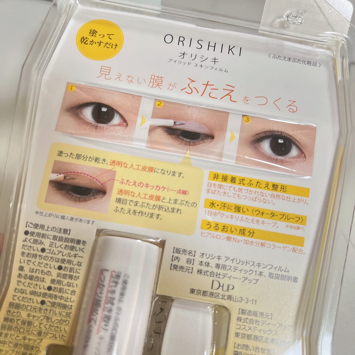- 2020年6月3日 膜が強くなってリニューアル発売! 塗って乾かすだけのふたえ整形フィルム。見えない膜がふたえをつくり、自然なふたえが完成します。非接着タイプでまぶたを貼り付けないので、目を閉じても自然な仕上がり。まばたきしてもつっぱりません。水・汗に強いウォータプルーフでクッキリふたえをキープ。うるおい成分のヒアルロン酸・コラーゲン配合。