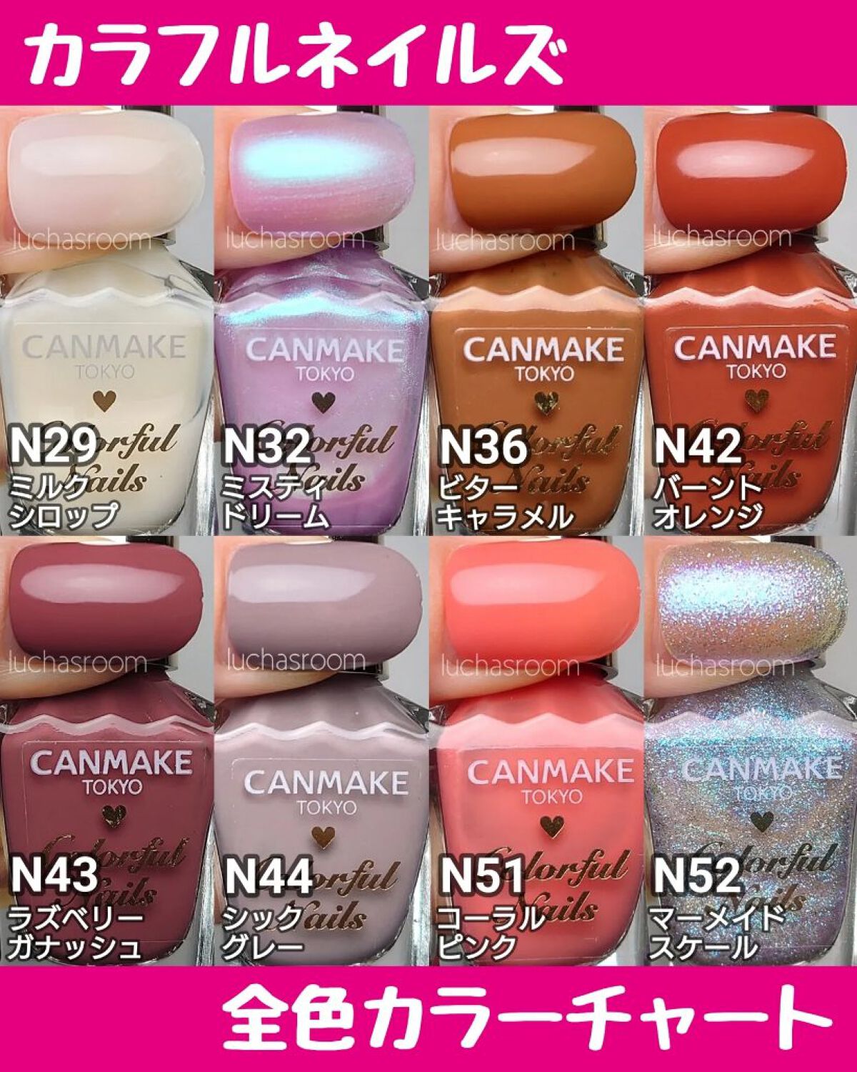 ⚠️更新版投稿しました⚠️こちらのハッシュタグからとべます▶#カラーチャートluchasroom完全保存版‼️ダイソーでネイルポリッシュを買うときに必携!ダイソーの3大ネイルポリッシュ、GENEネイル、フレンドネイル、ソンプチューの全色カラー...