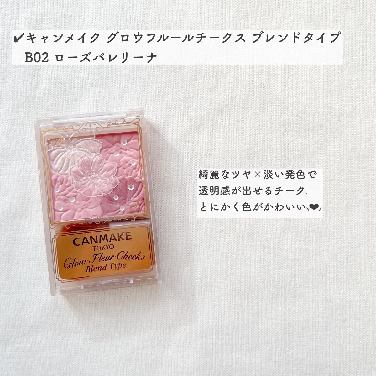 キャンメイク グロウフルールチークス ブレンドタイプ/ B02ローズバレリーナ じゅわっと内側から滲み出るような血色感を出せるチーク💕 細かいパールが入ってて発光したようなツヤ感が出せるよ♡ 淡めの発色なので初心者さんにもおすすめ!