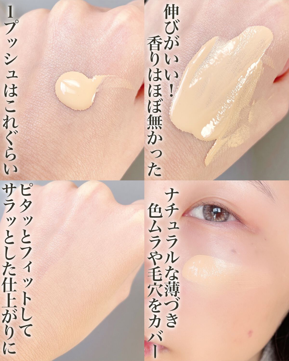 約70%スキンケアベースのフォーミュラが、潤いヴェールで肌を心地よく包み込む。 これまでのリキッドファンデの中でダントツ崩れにくく、ほうれい線にもファンデ溜まりにくいです! 自然なカバー力があり、肌が綺麗に見えて気に入っています。