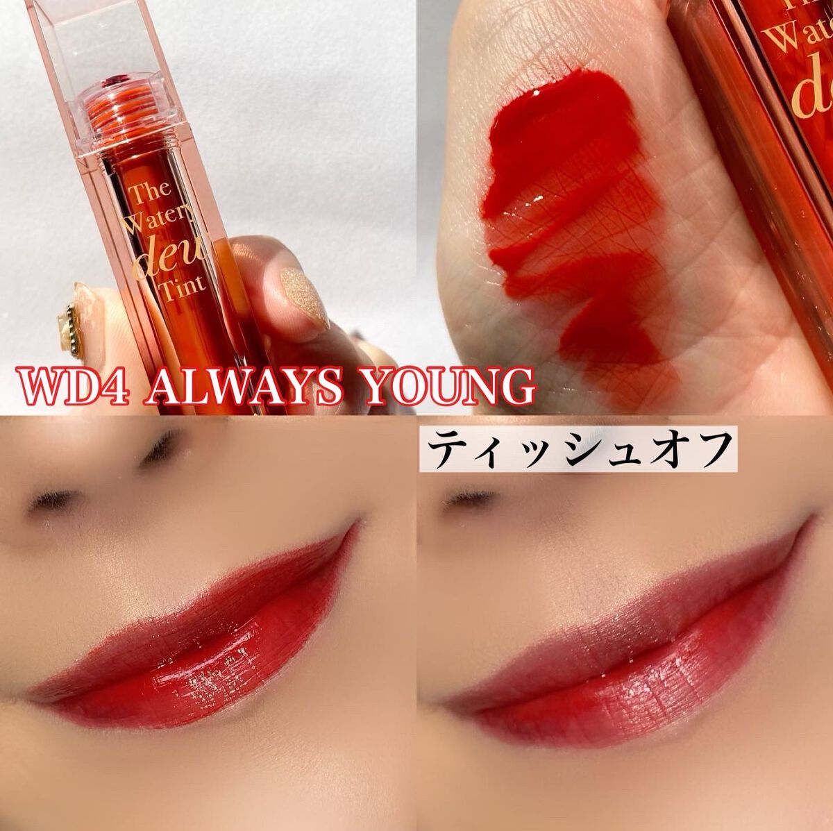 - <WD2 ビトゥン ローズ> 水、ジフェニルジメチコン、リンゴ酸ジイソステアリル、ビスジグリセリルポリアシルアジペート-2、水添ポリイソブテン、ジグリセリン、DPG、セチルPEG/PPG-10/1ジメチコン、イソステアリン酸ソルビタン、ポリソルベート60、ペンチレングリコール、オクチルドデカノール、セテアレス-20、(アクリル酸ヒドロキシエチル/アクリロイルジメチルタウリンNa)コポリマー、スクワラン、フェノキシエタノール、ポリグリセリン-3、ステビオシド、香料、エチルヘキシルグリセリン、グリセリン、シア脂、ツバキ種子油、トリ(カプリル酸/カプリン酸)グリセリル、アルガニアスピノサ核油、ホホバ種子油、アーモンド油、アンズ核油、月見草油、オリーブ果実油、テトラ(ジ-t-ブチルヒドロキシヒドロケイヒ酸)ペンタエリスリチル、カニナバラ果実エキス、マンゴー果実エキス、赤104(1)、赤227、黄5、青1 <WD3 ピンク ヘイズ> 水、ジフェニルジメチコン、リンゴ酸ジイソステアリル、ビスジグリセリルポリアシルアジペート-2、水添ポリイソブテン、ジグリセリン、DPG、セチルPEG/PPG-10/1ジメチコン、イソステアリン酸ソルビタン、ポリソルベート60、ペンチレングリコール、オクチルドデカノール、セテアレス-20、(アクリル酸ヒドロキシエチル/アクリロイルジメチルタウリンNa)コポリマー、スクワラン、フェノキシエタノール、ポリグリセリン-3、ステビオシド、香料、エチルヘキシルグリセリン、グリセリン、水酸化Al、ポリアクリル酸アンモニウム、BG、アルガニアスピノサ核油、シア脂、ツバキ種子油、トリ(カプリル酸/カプリン酸)グリセリル、アーモンド油、アンズ核油、ホホバ種子油、月見草油、オリーブ果実油、テトラ(ジ-t-ブチルヒドロキシヒドロケイヒ酸)ペンタエリスリチル、マンゴー果実エキス、カニナバラ果実エキス、酸化チタン、赤104(1)、赤227、黄5、青1 <WD4 オールウェイズ ヤング> 水、ジフェニルジメチコン、リンゴ酸ジイソステアリル、ビスジグリセリルポリアシルアジペート-2、水添ポリイソブテン、ジグリセリン、DPG、セチルPEG/PPG-10/1ジメチコン、イソステアリン酸ソルビタン、ポリソルベート60、ペンチレングリコール、オクチルドデカノール、セテアレス-20、(アクリル酸ヒドロキシエチル/アクリロイルジメチルタウリンNa)コポリマー、スクワラン、フェノキシエタノール、ポリグリセリン-3、ステビオシド、香料、エチルヘキシルグリセリン、グリセリン、シア脂、ツバキ種子油、トリ(カプリル酸/カプリン酸)グリセリル、アルガニアスピノサ核油、ホホバ種子油、アーモンド油、アンズ核油、月見草油、オリーブ果実油、テトラ(ジ-t-ブチルヒドロキシヒドロケイヒ酸)ペンタエリスリチル、カニナバラ果実エキス、マンゴー果実エキス、赤104(1)、赤227、黄5、青1 <WD6 クラッシュド パンプキン> 水、水添ポリイソブテン、リンゴ酸ジイソステアリル、ビスジグリセリルポリアシルアジペート-2、ジフェニルシロキシフェニルトリメチコン、ジフェニルジメチコン、ポリグリセリン-3、オクチルドデカノール、ポリソルベート60、セチルPEG/PPG-10/1ジメチコン、ラウリン酸ポリグリセリル-10、ペンチレングリコール、1,2-ヘキサンジオール、(アクリル酸ヒドロキシエチル/アクリロイルジメチルタウリンNa)コポリマー、PEG-60水添ヒマシ油、セテアリルアルコール、スクワラン、キシリトール、エチルヘキシルグリセリン、香料、ポリアクリル酸アンモニウム、イソステアリン酸ソルビタン、水酸化Al、フェノキシエタノール、BG、トコフェロール、酸化チタン、酸化鉄、赤227、黄4、黄5、青1 <WD8 ビンテージ カラント> 水、水添ポリイソブテン、リンゴ酸ジイソステアリル、ビスジグリセリルポリアシルアジペート-2、ジフェニルシロキシフェニルトリメチコン、ジフェニルジメチコン、オクチルドデカノール、ポリグリセリン-3、ポリソルベート60、セチルPEG/PPG-10/1ジメチコン、ラウリン酸ポリグリセリル-10、1,2-ヘキサンジオール、ペンチレングリコール、(アクリル酸ヒドロキシエチル/アクリロイルジメチルタウリンNa)コポリマー、PEG-60水添ヒマシ油、セテアリルアルコール、スクワラン、キシリトール、エチルヘキシルグリセリン、香料、イソステアリン酸ソルビタン、トコフェロール、赤104(1)、赤227、黄5、青1 <WD9 ミスター ストレンジャー> 水、水添ポリイソブテン、リンゴ酸ジイソステアリル、ビスジグリセリルポリアシルアジペート-2、ジフェニルシロキシフェニルトリメチコン、ジフェニルジメチコン、オクチルドデカノール、ポリグリセリン-3、ポリソルベート60、セチルPEG/PPG-10/1ジメチコン、ラウリン酸ポリグリセリル-10、1,2-ヘキサンジオール、ペンチレングリコール、(アクリル酸ヒドロキシエチル/アクリロイルジメチルタウリンNa)コポリマー、セテアリルアルコール、PEG-60水添ヒマシ油、スクワラン、キシリトール、エチルヘキシルグリセリン、香料、イソステアリン酸ソルビタン、水酸化Al、ポ