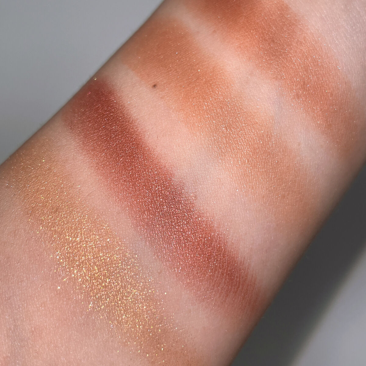 全体的に淡めです! イエベ向きな黄色みのあるブラウン系🤎 シマーなラメが可愛すぎる!! 密着度の高いラメでポンと乗せるだけで キラッキラ✨✨ 粉飛びもしないです! 発色はいいですが淡いので 初心者さんでも使いやすい!!!