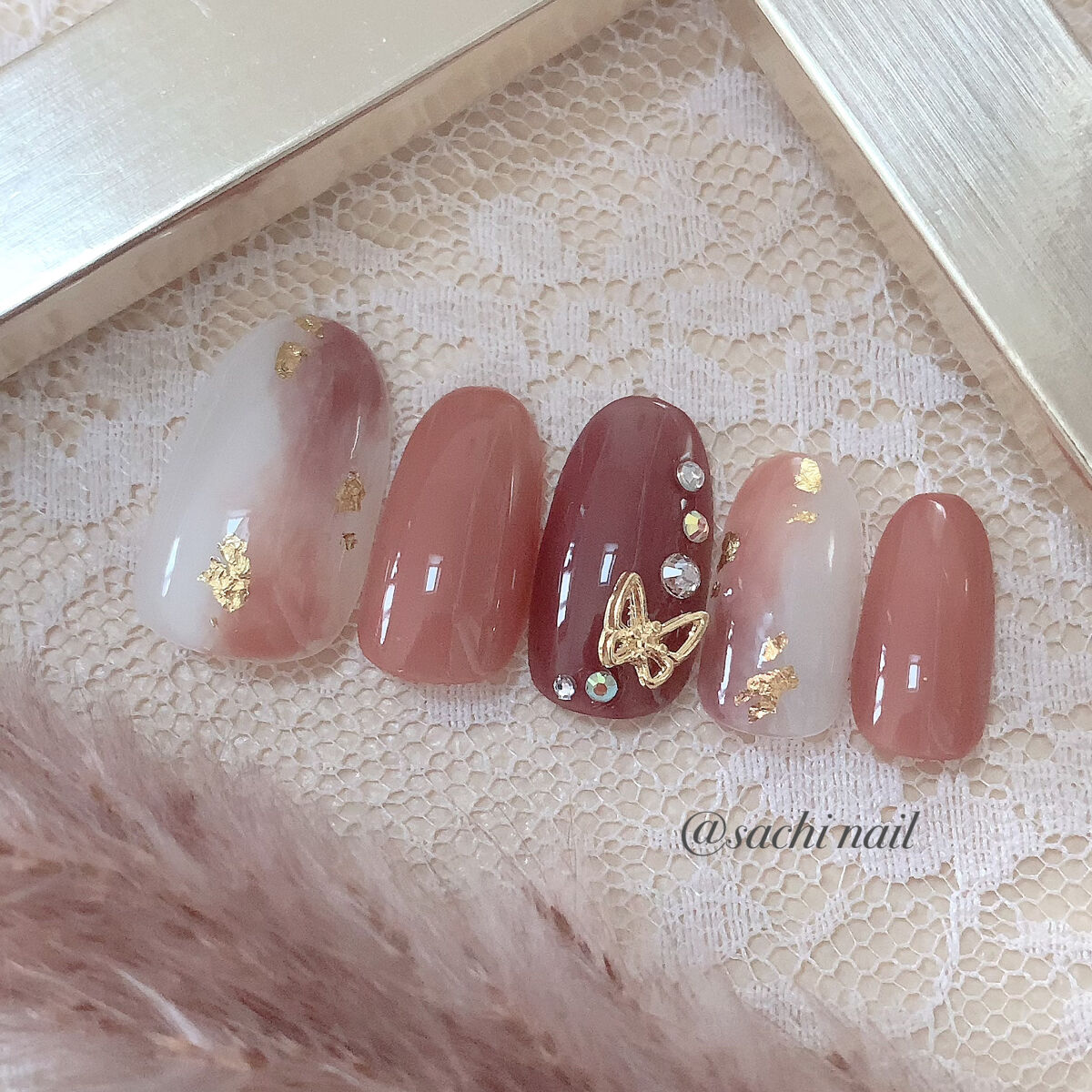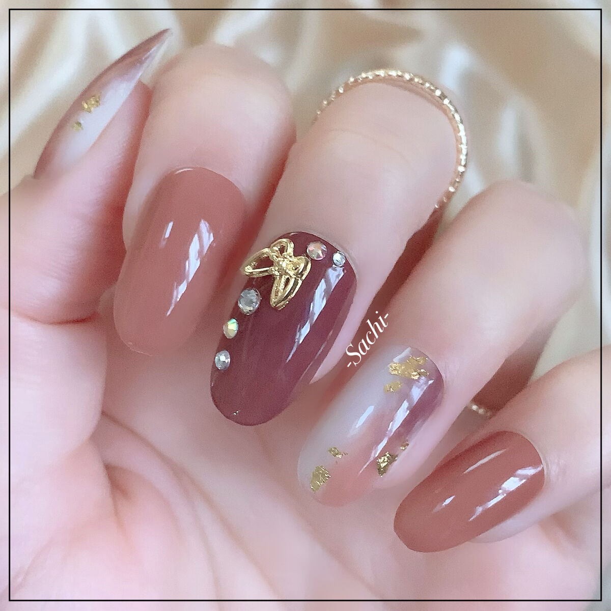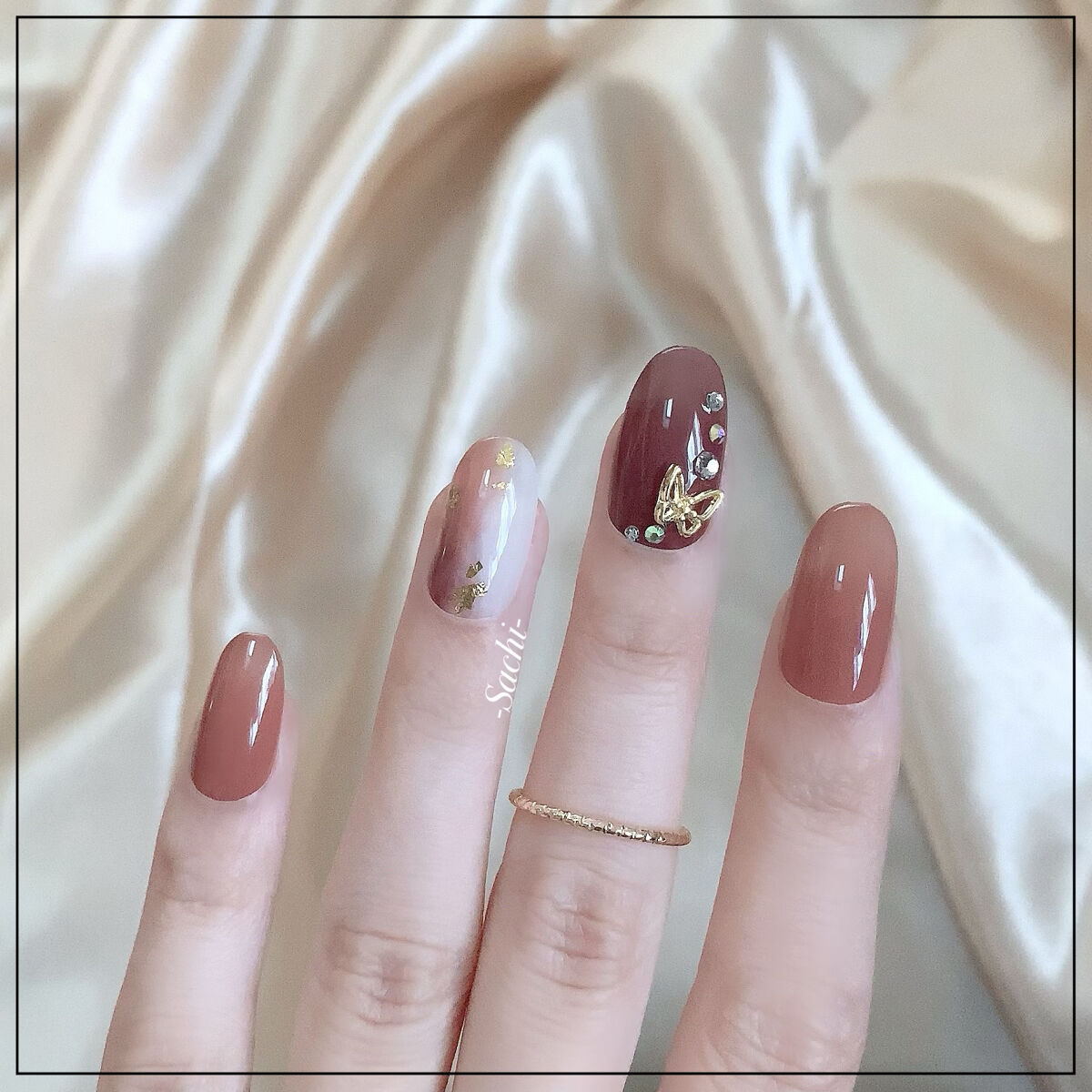 ワンカラーでも指ごとに色を変えるだけでオシャレに見えます💕 画像のようにゴールドラインとストーンを少し足すだけで華やかさがアップ🥰 何度かご紹介したことのあるスポンジで作るグラデーションです✨ スポンジを使うことで境目が綺麗に馴染んでくれます💕 アルミホイルの上でブラウンとトップコートを1:1くらいで混ぜたものを、トップコートのハケに取って3箇所に塗るだけ👌 事前に混ぜたものを塗ることで、爪の上でぼかすより簡単に出来ます💕 ベースカラーが乾く前に点置きしてぼかすことで綺麗にぼかせます✨ スピードが大事なので、使うポリッシュのキャップは全て開けておきましょう😊 天然石のラインはガタガタの方がより天然石っぽく見えるので、ラインを描くのが苦手な方でも大丈夫🙆♀️ 難しそうに見えて、やってみると意外と簡単に出来ます♡