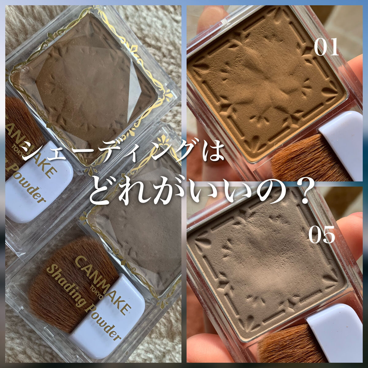 キャンメイクシェーディングパウダー05ムーングレージュというカラーです。これは日本人の肌に合う色だと思います!748円(安すぎ)ドラストで購入できます。 粉質はサラサラで、筆付きなのでめちゃくちゃ楽ちんです。ありがとう。底見えまでに3年かかってるのでコスパもいいです。 色味は本当に肌に馴染みます。自然。ナチュラル。ナチュラルボーン。