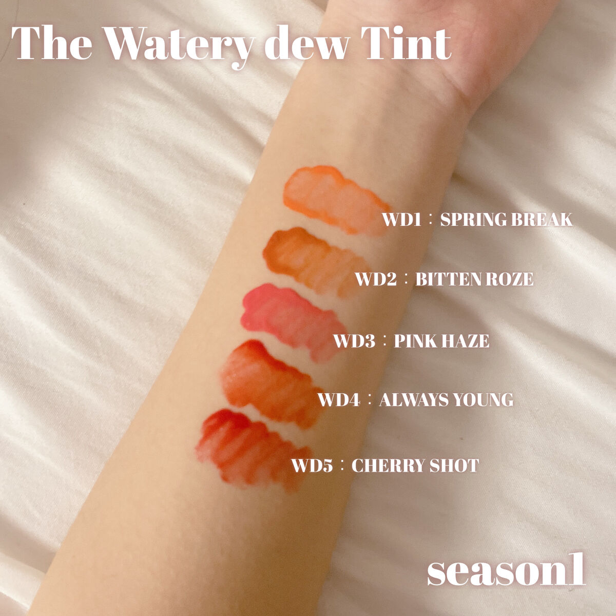- <WD2 ビトゥン ローズ> 水、ジフェニルジメチコン、リンゴ酸ジイソステアリル、ビスジグリセリルポリアシルアジペート-2、水添ポリイソブテン、ジグリセリン、DPG、セチルPEG/PPG-10/1ジメチコン、イソステアリン酸ソルビタン、ポリソルベート60、ペンチレングリコール、オクチルドデカノール、セテアレス-20、(アクリル酸ヒドロキシエチル/アクリロイルジメチルタウリンNa)コポリマー、スクワラン、フェノキシエタノール、ポリグリセリン-3、ステビオシド、香料、エチルヘキシルグリセリン、グリセリン、シア脂、ツバキ種子油、トリ(カプリル酸/カプリン酸)グリセリル、アルガニアスピノサ核油、ホホバ種子油、アーモンド油、アンズ核油、月見草油、オリーブ果実油、テトラ(ジ-t-ブチルヒドロキシヒドロケイヒ酸)ペンタエリスリチル、カニナバラ果実エキス、マンゴー果実エキス、赤104(1)、赤227、黄5、青1 <WD3 ピンク ヘイズ> 水、ジフェニルジメチコン、リンゴ酸ジイソステアリル、ビスジグリセリルポリアシルアジペート-2、水添ポリイソブテン、ジグリセリン、DPG、セチルPEG/PPG-10/1ジメチコン、イソステアリン酸ソルビタン、ポリソルベート60、ペンチレングリコール、オクチルドデカノール、セテアレス-20、(アクリル酸ヒドロキシエチル/アクリロイルジメチルタウリンNa)コポリマー、スクワラン、フェノキシエタノール、ポリグリセリン-3、ステビオシド、香料、エチルヘキシルグリセリン、グリセリン、水酸化Al、ポリアクリル酸アンモニウム、BG、アルガニアスピノサ核油、シア脂、ツバキ種子油、トリ(カプリル酸/カプリン酸)グリセリル、アーモンド油、アンズ核油、ホホバ種子油、月見草油、オリーブ果実油、テトラ(ジ-t-ブチルヒドロキシヒドロケイヒ酸)ペンタエリスリチル、マンゴー果実エキス、カニナバラ果実エキス、酸化チタン、赤104(1)、赤227、黄5、青1 <WD4 オールウェイズ ヤング> 水、ジフェニルジメチコン、リンゴ酸ジイソステアリル、ビスジグリセリルポリアシルアジペート-2、水添ポリイソブテン、ジグリセリン、DPG、セチルPEG/PPG-10/1ジメチコン、イソステアリン酸ソルビタン、ポリソルベート60、ペンチレングリコール、オクチルドデカノール、セテアレス-20、(アクリル酸ヒドロキシエチル/アクリロイルジメチルタウリンNa)コポリマー、スクワラン、フェノキシエタノール、ポリグリセリン-3、ステビオシド、香料、エチルヘキシルグリセリン、グリセリン、シア脂、ツバキ種子油、トリ(カプリル酸/カプリン酸)グリセリル、アルガニアスピノサ核油、ホホバ種子油、アーモンド油、アンズ核油、月見草油、オリーブ果実油、テトラ(ジ-t-ブチルヒドロキシヒドロケイヒ酸)ペンタエリスリチル、カニナバラ果実エキス、マンゴー果実エキス、赤104(1)、赤227、黄5、青1 <WD6 クラッシュド パンプキン> 水、水添ポリイソブテン、リンゴ酸ジイソステアリル、ビスジグリセリルポリアシルアジペート-2、ジフェニルシロキシフェニルトリメチコン、ジフェニルジメチコン、ポリグリセリン-3、オクチルドデカノール、ポリソルベート60、セチルPEG/PPG-10/1ジメチコン、ラウリン酸ポリグリセリル-10、ペンチレングリコール、1,2-ヘキサンジオール、(アクリル酸ヒドロキシエチル/アクリロイルジメチルタウリンNa)コポリマー、PEG-60水添ヒマシ油、セテアリルアルコール、スクワラン、キシリトール、エチルヘキシルグリセリン、香料、ポリアクリル酸アンモニウム、イソステアリン酸ソルビタン、水酸化Al、フェノキシエタノール、BG、トコフェロール、酸化チタン、酸化鉄、赤227、黄4、黄5、青1 <WD8 ビンテージ カラント> 水、水添ポリイソブテン、リンゴ酸ジイソステアリル、ビスジグリセリルポリアシルアジペート-2、ジフェニルシロキシフェニルトリメチコン、ジフェニルジメチコン、オクチルドデカノール、ポリグリセリン-3、ポリソルベート60、セチルPEG/PPG-10/1ジメチコン、ラウリン酸ポリグリセリル-10、1,2-ヘキサンジオール、ペンチレングリコール、(アクリル酸ヒドロキシエチル/アクリロイルジメチルタウリンNa)コポリマー、PEG-60水添ヒマシ油、セテアリルアルコール、スクワラン、キシリトール、エチルヘキシルグリセリン、香料、イソステアリン酸ソルビタン、トコフェロール、赤104(1)、赤227、黄5、青1 <WD9 ミスター ストレンジャー> 水、水添ポリイソブテン、リンゴ酸ジイソステアリル、ビスジグリセリルポリアシルアジペート-2、ジフェニルシロキシフェニルトリメチコン、ジフェニルジメチコン、オクチルドデカノール、ポリグリセリン-3、ポリソルベート60、セチルPEG/PPG-10/1ジメチコン、ラウリン酸ポリグリセリル-10、1,2-ヘキサンジオール、ペンチレングリコール、(アクリル酸ヒドロキシエチル/アクリロイルジメチルタウリンNa)コポリマー、セテアリルアルコール、PEG-60水添ヒマシ油、スクワラン、キシリトール、エチルヘキシルグリセリン、香料、イソステアリン酸ソルビタン、水酸化Al、ポ