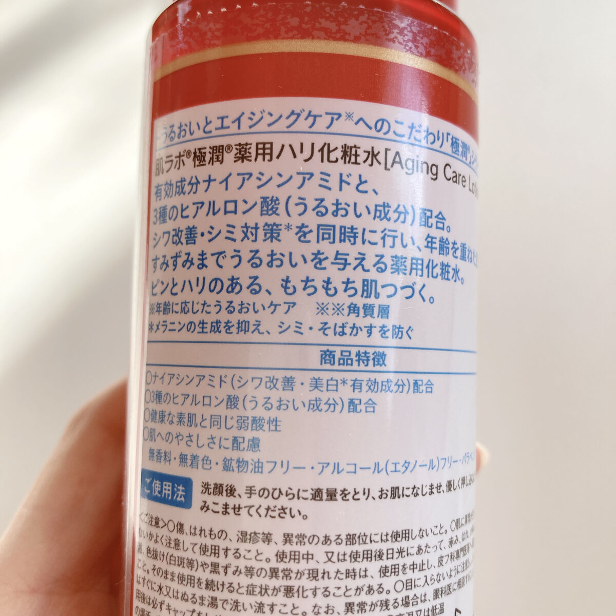 - 【医薬部外品】 エイジングケア*1にこだわった極潤シリーズです。有効成分ナイアシンアミドと、3種のヒアルロン酸(うるおい成分)配合。シワ改善・シミ対策*2を同時に行い、年齢を重ねた大人の肌*3に、すみずみまでうるおいを与える薬用化粧水です。無香料・無着色・鉱物油フリー・アルコール(エタノール)フリー・パラベンフリー。*1:年齢に応じたうるおいケア*2:メラニンの生成を抑え、シミ・そばかすを防ぐ*3:角質層