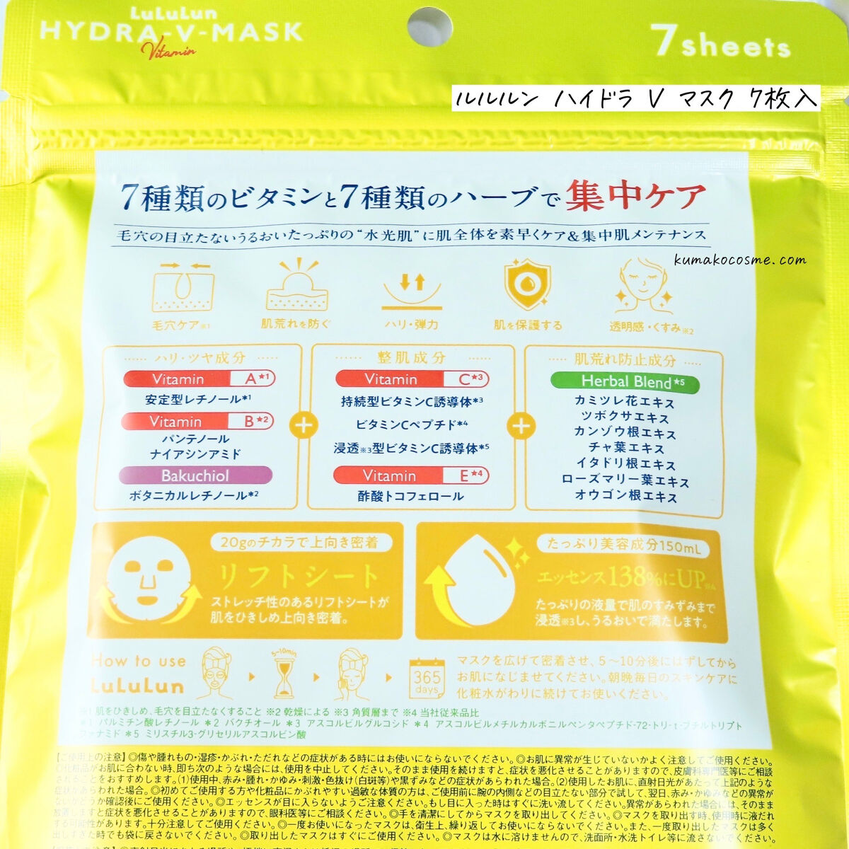 - ルルルンからビタミンたっぷりの化粧水フェイスマスクが新登場。 7種類のビタミン※1と7種類のハーブ※1で肌全体を素早くケア&集中肌メンテナンス。 新開発のフェイスラインに密着するシートで肌を引き締めながら肌のすみずみ※2までうるおいで満たし、毛穴の目立たないうるおいたっぷりの“水光肌”へ。 (※1 全て保湿成分として ※2 角質層まで)