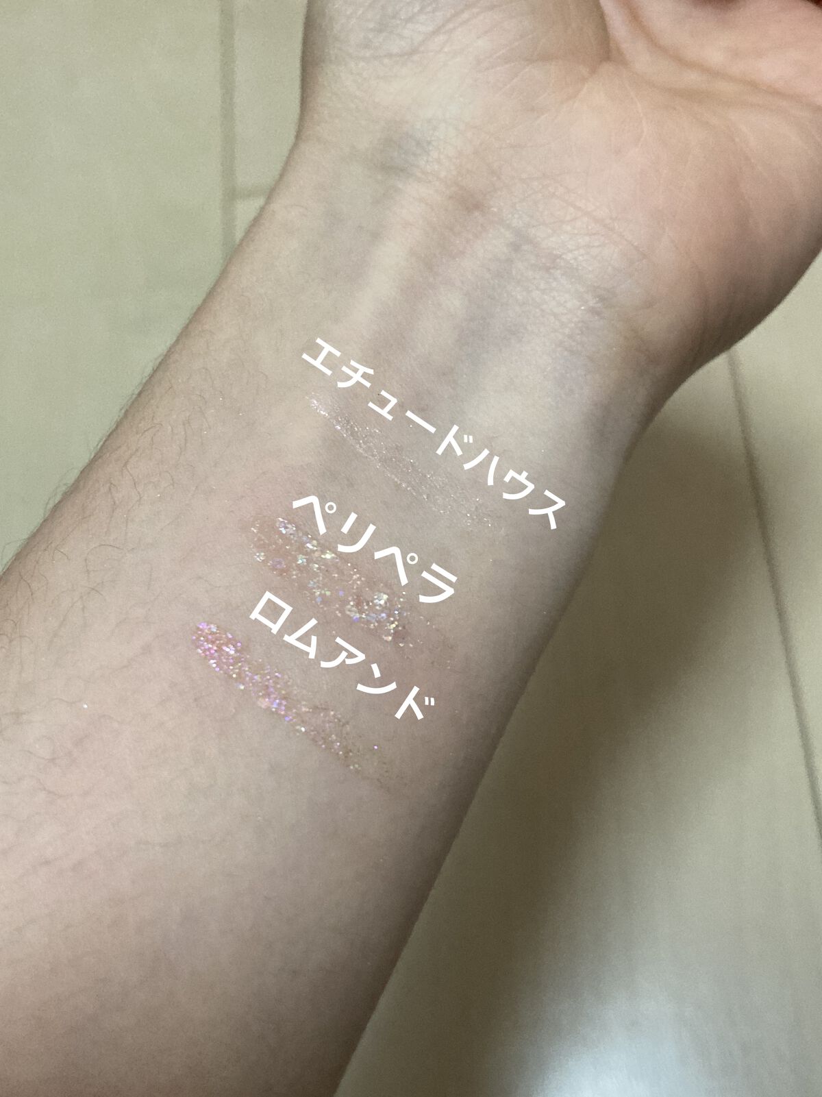 エチュードハウス ティアーアイライナー細かいラメがキラキラと可愛いお品。簡単にうるうる涙袋に慣れちゃうのも魅力的! ペリペラ シュガートゥインクルリキッドグリッターエチュードハウスのものに比べるとラメが大きく大胆に輝いてくれる! ロムアンド リキッドグリッターシャドウエチュードハウスとペリペラの間くらいの輝き。しっかり発光してくれるのに、乾くと擦れに強い!