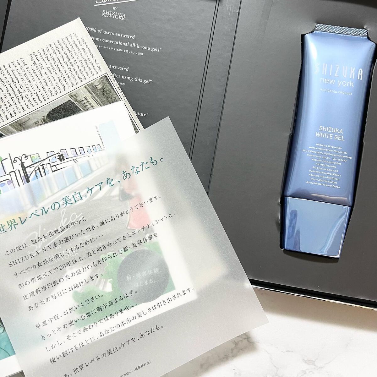 - シミ、シワ、毛穴、肌あれ、乾燥・・・ さまざまな肌悩みを多角的にケアする「シズカホワイトゲル」。 化粧水・美容液・乳液・クリーム・パックの5つの機能をこの1本で。 美白、シワ改善で知られるナイアシンアミドをはじめ、豊富な美容成分を含んだゲルは無添加で医薬部外品。効能評価試験済で、安心してお使いいただけます。