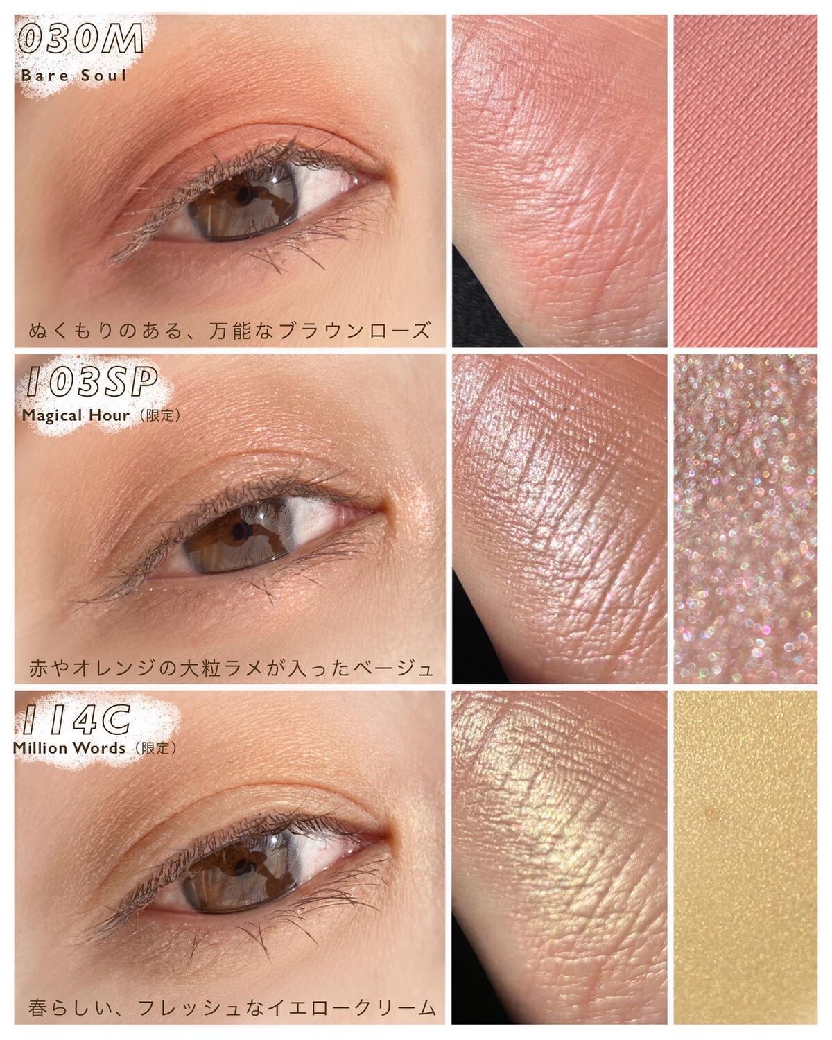 2023年にどどんとリニューアル!全30色展開で新たに発売をスタートしました。 多色パールがこれでもか!ってくらいたっぷり煌めくピンクベージュはほんの少しオレンジのニュアンスも感じられるヘルシーなカラー。 こういうピンクベージュ系の単色シャドウって、ほんとにメイクのベース的に使いやすくて重宝するのよね😚