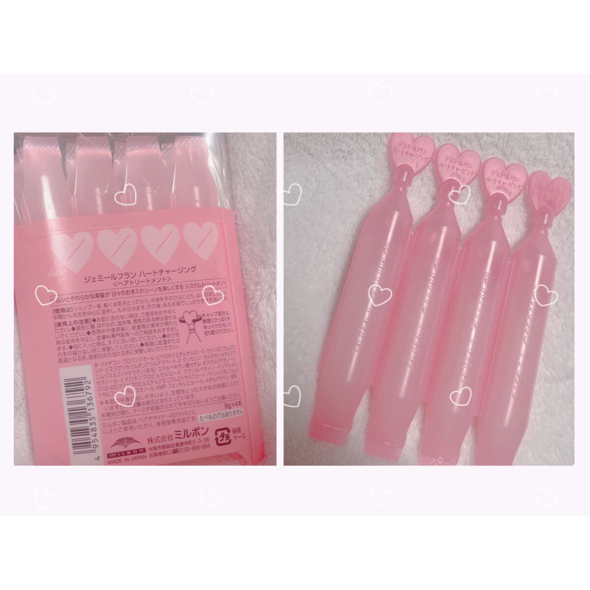 MILBONのトリートメント💓¥660-🎀軟毛の方向けのヘアトリートメント🎀乾かすだけでツルンと整う髪を持続させます🎀いつものトリートメントの代わりに週1回使用🎀ピオニーを基調とした、ふんわりと軽やかで上品な香りジェミールフラン ハートチャー...