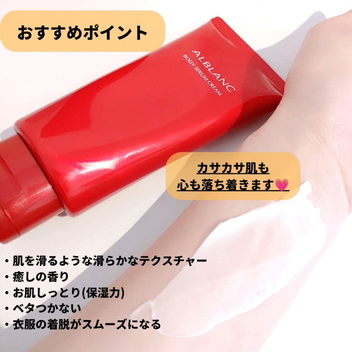 まじで一生愛します!!!永遠リピします🩷🩷ボディクリームはこれしか使いませんレベルにおすすめです!!⠀ᐠ♥︎ᐟ⠀⠀ᐠ♥︎ᐟALBLANCボディセラムクリーム⠀⠀*香り⠀アルブラン特有のリーフィーグリーンフローラルの香り🍃⠀*色⠀真っ白!⠀*テ...