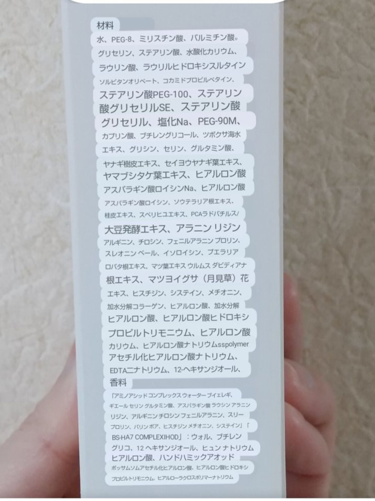 低分子ヒアルロン酸、コラーゲン、ガラクトミセス、サッカロミセス、グリチルリチン酸ジカリウム、アズレン、キシリトール、ビタミンC誘導体、バクチオール 高濃度ビタミンC(20%越えるとぴりぴりする)、高濃度ナイアシンアミド(10%越えるとぴりぴりする)、レチノール(毎回A反応がひどい)、ヘパリン類似物質(赤みが悪化する)、針(痛いしかぶれる) 植物系エキスは濃度や抽出法で違いが出そうなので入れてません 同じ植物のエキスでもめちゃくちゃしみるのがある😢