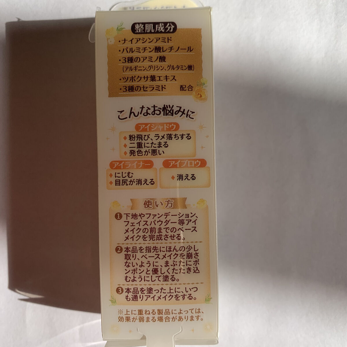 - 2024.6月下旬~ 01の全成分が順次リニューアル 尚、これにかかる商品の返品・交換は承っておりません。 崩したくない!アイメイクをしっかりキープ!! アイシャドウ・アイブロウ・アイライナー、マルチに使えるアイメイク下地 アイメイクを重ねた瞬間、発色UP! しっかりと密着してにじみやヨレを防ぎ、つけたての仕上がりを長時間キープ! ラメ・パールなし。 01:フロスティクリア 塗ると透明になり、どんなアイカラーにも! 02:クリームイエロー お肌に嬉しい5種の整肌成分配合のイエロータイプ ナイアシンアミド・パルミチン酸レチノール・3種のアミノ酸・ツボクサ葉エキス・3種のセラミド配合
