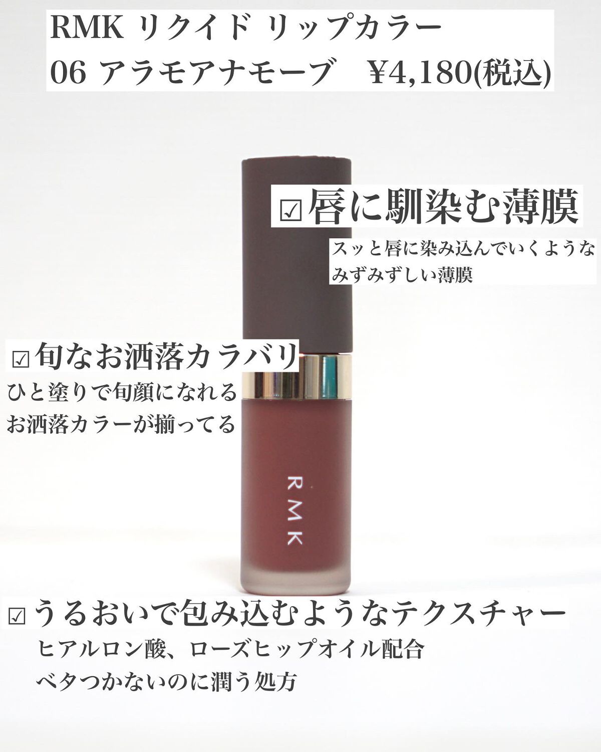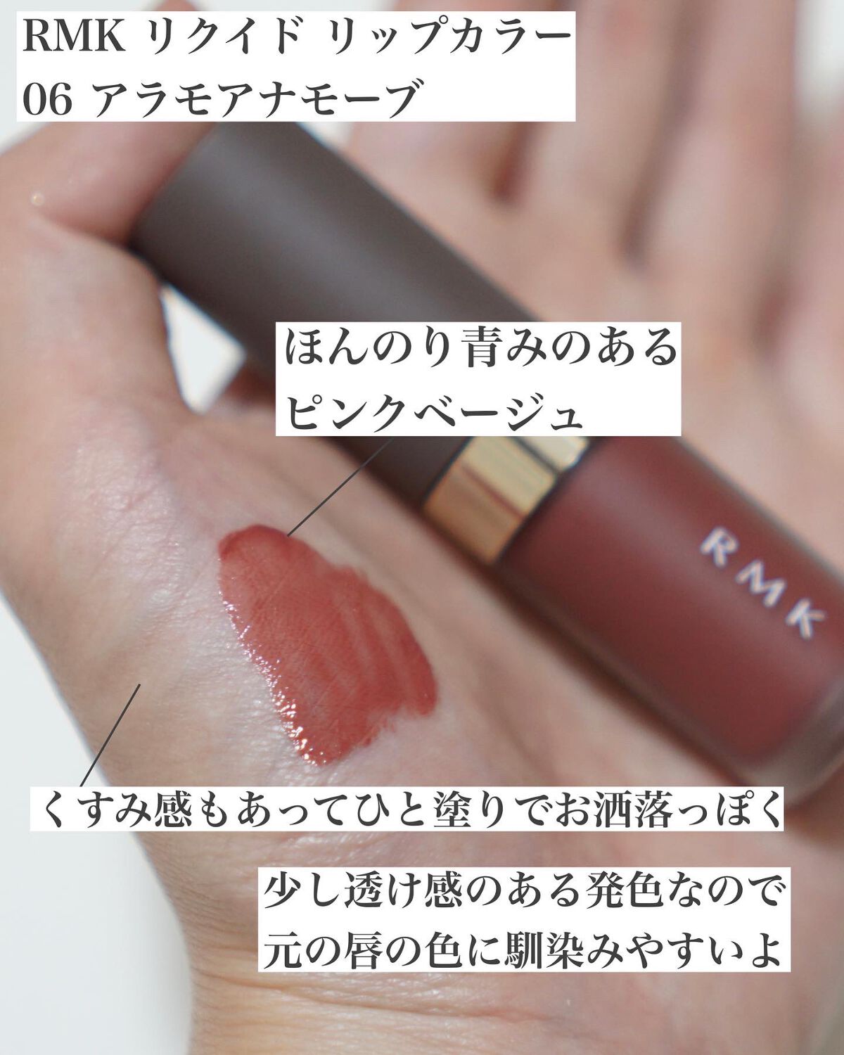 程よい薄膜を纏うような透け感のある美発色なリキッドリップ。 ピタッと密着しフィット!保湿力も色持ちも良い 06はブラウンとモーヴを絶妙に混ぜたような青みすぎないモーヴニュアンスのカラー。 抜け感がありおしゃれな印象に◎ ブルベにおすすめ!