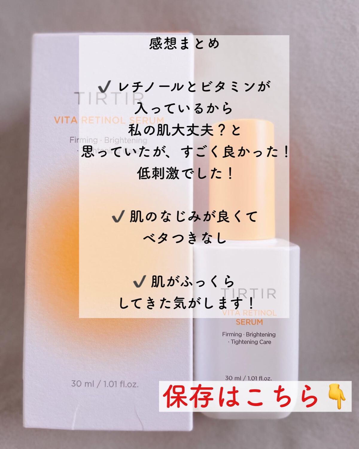 ※2024年使用品美容液・商品名TIRTIR(ティルティル)ビタレチノールセラム30ml・値段定価2970円(1300円で購入)・購入場所ツルハ・評価★★☆☆☆とても容器重い(よく落とす)ゆるめの乳液っぽいテクスチャ香りはなくて使いやすいプッ...