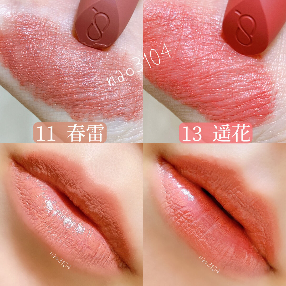 前回の全色スウォッチは #なおCHANEL 62よりも一見青み?灰み?が強いものの私でもなんなく使える馴染み色。 わずかにローズ感じるくすみピンク。ピンクリップが似合わない私ですがこれは挑戦したい!と思うオシャレな色。 ラックの中では数少ないコーラル。ついつい62番ばかり使ってしまいそうでしたが、PCスプリングを全面に演出したい時はこれ♪ 65より明度の高い限りなくピンク寄りのコーラル。手に出した時は蛍光っぽいなーと思ったけど、つけるとしっくり。この春らしい明るくて程よい黄みのある可愛い色です。 こちらも長期欠品していた人気色。ブラウンリップに挑戦したいけど、顔色悪くなっちゃう…とか、唇だけ目立っちゃう…って方にオススメしたい! 10月発売の新色。待っていたオレンジ系コーラル!個人的にはこのリップのシリーズで一番好き! こちらも10月発売の新色。82よりややしっかり発色で、秋冬にピッタリです。