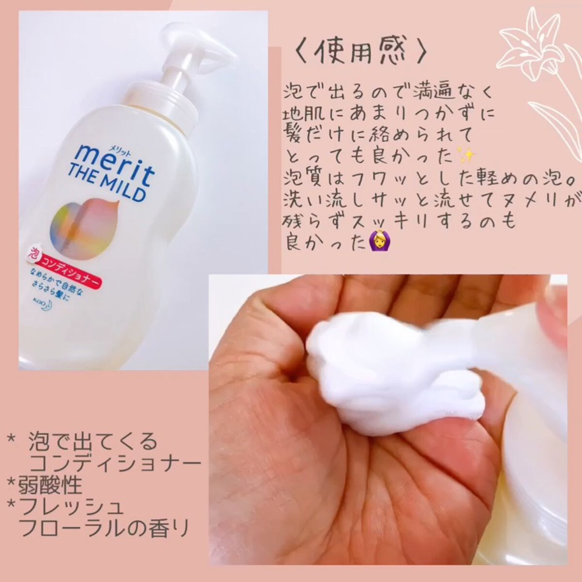 - シャンプーを泡立てる時、地肌をゴシゴシしていたり、コンディショナーのぬるつきが気になるといった地肌をやさしく洗いたい方に着目。 メリット ザマイルドは地肌へのやさしさを考えて、シャンプーもコンディショナーも最初からふわもこ泡で出る泡タイプ。 最初から泡だから、泡立て時にゴシゴシせずに摩擦を防いで地肌と髪をやさしく清潔に洗い上げます。 コンディショナーも泡だから、むらなくなじんで、なめらかで自然なさらさら髪に仕上げます。