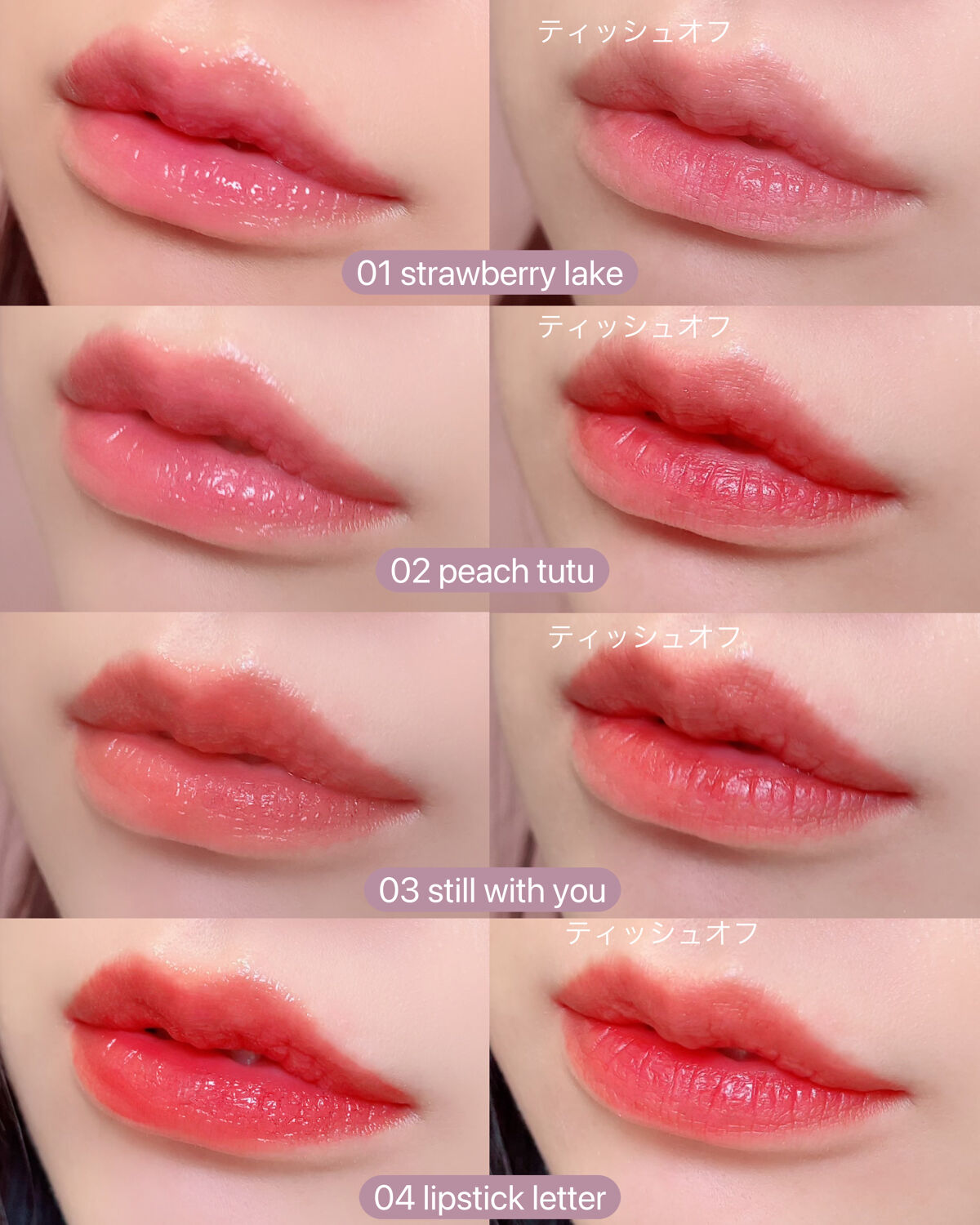 - <01 strawberry lake> 水、イソノナン酸イソトリデシル、ジメチコン、オクチルドデカノール、グリセリン、DPG、フェニルトリメチコン、トリメチルシロキシケイ酸、ポリソルベート60、イソドデカン、ジフェニルシロキシフェニルトリメチコン、ペンチレングリコール、カプリリルメチコン、(アクリル酸ヒドロキシエチル/アクリロイルジメチルタウリンNa)コポリマー、1,2-ヘキサンジオール、セテアレス-20、アボカド油、トコフェロール、ラベンダー花エキス、ローズマリー葉エキス、BG、イソステアリン酸ソルビタン、エチレンジアミンジコハク酸3Na、スクワラン、ポリアクリル酸アンモニウム、ポリアクリレート-13、ポリイソブテン、ポリソルベート20、ラウリルPEG-9ポリジメチルシロキシエチルジメチコン、水酸化Al、フェノキシエタノール、酸化チタン、黄4、黄5、青1、赤227 <02 peach tutu> 水、イソノナン酸イソトリデシル、ジメチコン、オクチルドデカノール、グリセリン、DPG、フェニルトリメチコン、トリメチルシロキシケイ酸、ポリソルベート60、イソドデカン、ジフェニルシロキシフェニルトリメチコン、ペンチレングリコール、カプリリルメチコン、(アクリル酸ヒドロキシエチル/アクリロイルジメチルタウリンNa)コポリマー、1,2-ヘキサンジオール、セテアレス-20、アボカド油、トコフェロール、ラベンダー花エキス、ローズマリー葉エキス、BG、イソステアリン酸ソルビタン、エチレンジアミンジコハク酸3Na、スクワラン、ポリアクリル酸アンモニウム、ポリアクリレート-13、ポリイソブテン、ポリソルベート20、ラウリルPEG-9ポリジメチルシロキシエチルジメチコン、水酸化Al、フェノキシエタノール、酸化チタン、黄4、黄5、青1、赤104(1)、赤227 <03 still with you> 水、イソノナン酸イソトリデシル、ジメチコン、オクチルドデカノール、グリセリン、DPG、フェニルトリメチコン、トリメチルシロキシケイ酸、ポリソルベート60、イソドデカン、ジフェニルシロキシフェニルトリメチコン、ペンチレングリコール、カプリリルメチコン、(アクリル酸ヒドロキシエチル/アクリロイルジメチルタウリンNa)コポリマー、1,2-ヘキサンジオール、セテアレス-20、アボカド油、トコフェロール、ラベンダー花エキス、ローズマリー葉エキス、BG、イソステアリン酸ソルビタン、エチレンジアミンジコハク酸3Na、スクワラン、ポリアクリル酸アンモニウム、ポリアクリレート-13、ポリイソブテン、ポリソルベート20、ラウリルPEG-9ポリジメチルシロキシエチルジメチコン、水酸化Al、フェノキシエタノール、酸化チタン、黄4、黄5、青1、赤104(1)、赤227 <04 lipstick letter> 水、イソノナン酸イソトリデシル、ジメチコン、オクチルドデカノール、グリセリン、DPG、フェニルトリメチコン、トリメチルシロキシケイ酸、ポリソルベート60、イソドデカン、ジフェニルシロキシフェニルトリメチコン、ペンチレングリコール、カプリリルメチコン、(アクリル酸ヒドロキシエチル/アクリロイルジメチルタウリンNa)コポリマー、1,2-ヘキサンジオール、セテアレス-20、アボカド油、トコフェロール、ラベンダー花エキス、ローズマリー葉エキス、BG、イソステアリン酸ソルビタン、エチレンジアミンジコハク酸3Na、スクワラン、ポリアクリル酸アンモニウム、ポリアクリレート-13、ポリイソブテン、ポリソルベート20、ラウリルPEG-9ポリジメチルシロキシエチルジメチコン、水酸化Al、フェノキシエタノール、酸化チタン、黄4、黄5、青1、赤104(1)、赤227 <05 sunset afterglow > 水、イソノナン酸イソトリデシル、ジメチコン、オクチルドデカノール、グリセリン、DPG、フェニルトリメチコン、トリメチルシロキシケイ酸、ポリソルベート60、イソドデカン、ジフェニルシロキシフェニルトリメチコン、ペンチレングリコール、カプリリルメチコン、(アクリル酸ヒドロキシエチル/アクリロイルジメチルタウリンNa)コポリマー、1,2-ヘキサンジオール、セテアレス-20、アボカド油、トコフェロール、ラベンダー花エキス、ローズマリー葉エキス、BG、イソステアリン酸ソルビタン、エチレンジアミンジコハク酸3Na、スクワラン、ポリアクリル酸アンモニウム、ポリアクリレート-13、ポリイソブテン、ポリソルベート20、ラウリルPEG-9ポリジメチルシロキシエチルジメチコン、水酸化Al、フェノキシエタノール、酸化チタン、黄5、青1、赤104(1)、赤227 <06 rosé at night> 水、イソノナン酸イソトリデシル、ジメチコン、オクチルドデカノール、グリセリン、DPG、フェニルトリメチコン、トリメチルシロキシケイ酸、ポリソルベート60、イソドデカン、ジフェニルシロキシフェニルトリメチコン、ペンチレングリコール、カプリリルメチコン、(アクリル酸ヒドロキシエチル/アクリロイルジメチルタウリンNa)コポリマー、1,2-ヘキサンジオール、セテアレス-20、アボカド油、トコフェロール、ラベンダー花エキス、ローズマリー葉エキス、BG、イソステアリン酸ソルビタン、エチレンジアミンジコハク