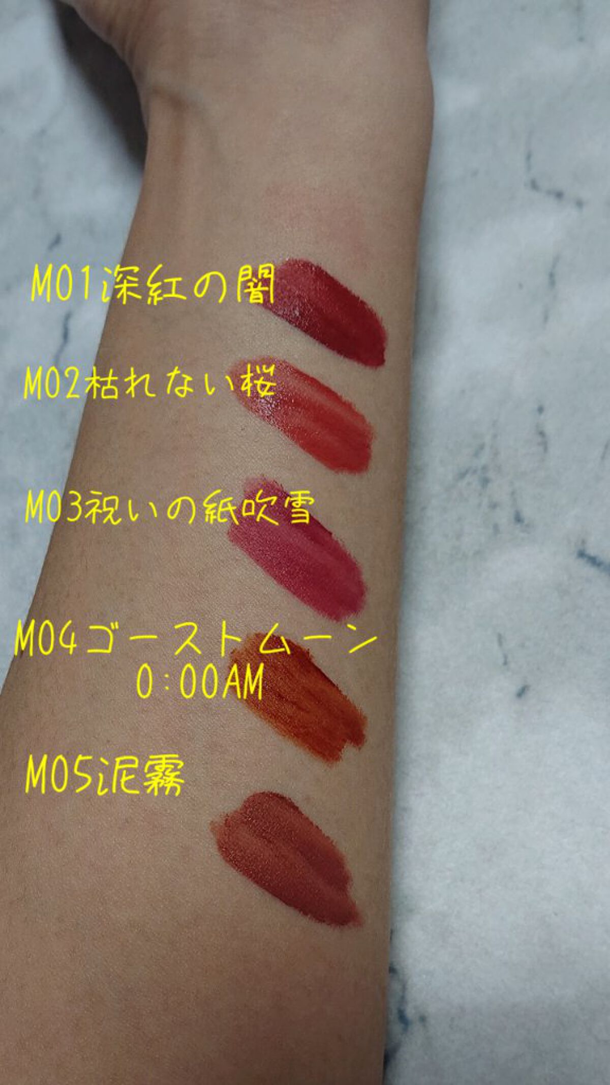 EX-1焦がした茶葉の余韻 EX-2501年熟成ワイン煮 冬らしいダークカラー。色持ち、ツヤ…は言うことなしのリップモンスター! 手持ちのマットタイプの泥霧ともカラー比較してみた。赤みが一番強いのがEX-2かなぁ?