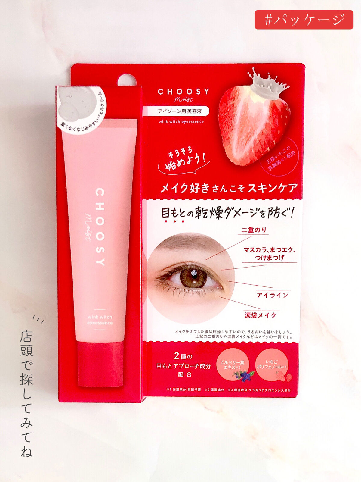 - ●アイメイクやクレンジングで摩擦ダメージの影響を受けやすい目元用美容液。 ●重くなくなじみやすいジェルクリームが肌の角質層にすーっと浸透して、メイク前にも使えます。 ●夜寝る前にたっぷり “ 塗るパック ” として使っても、ふっくら*潤いの続く目もとに。*角質層まで ●2 種の目もとアプローチ成分「ビルベリー葉エキス※ 1、いちごポリフェノール※ 2」配合。 ◆「王様いちごの乳酸菌※ 3」配合。 ◆グリセリンフリー処方。 ◆お手入れのテンションがあがる、みずみずしいストロベリーの香り。 ◆弱酸性、パラベンフリー、エタノールフリー。 ※1保湿成分 ※2保湿成分:フラガリアチロエンシス果汁 ※3乳酸桿菌