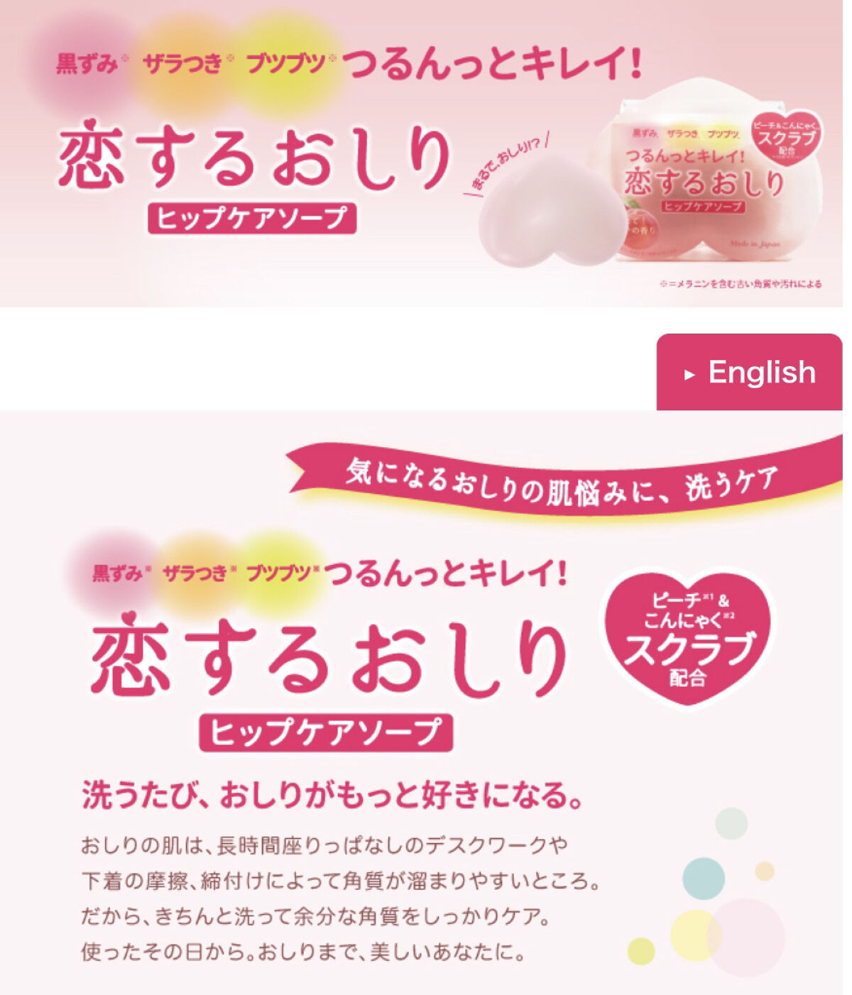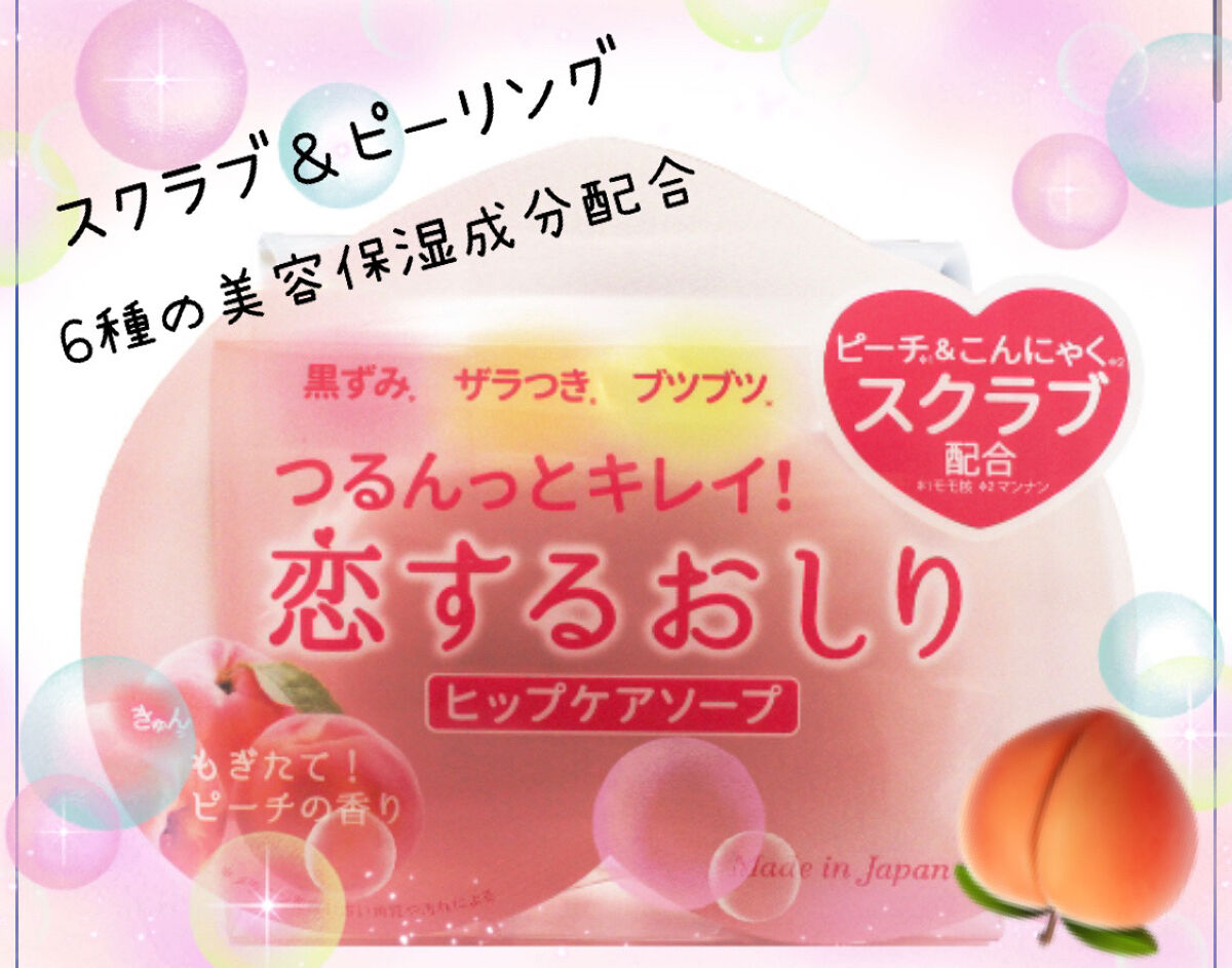 - 恋するおしり ヒップケアソープ おしりの黒ずみ・ザラつき・ブツブツにくるくる直接洗いの簡単ケア! (1)余分な古い角質を落とす:角質ケア スクラブ※1&ピーリング成分※2配合 【モモ核、マンナン※1 グルコノバクター/ハチミツ発酵液、 リンゴ酸・乳酸・クエン酸※2】 (2)必要なうるおいを守る:保湿ケア 6種※3の美容保湿エッセンスを配合 【モモ葉エキス、モモ種子エキス、ビワ葉エキス、キウイエキス、 アーチチョーク葉エキス、アロエベラ液汁※3】 ◎「きゅんっ」とする もぎたて!ピーチの香り