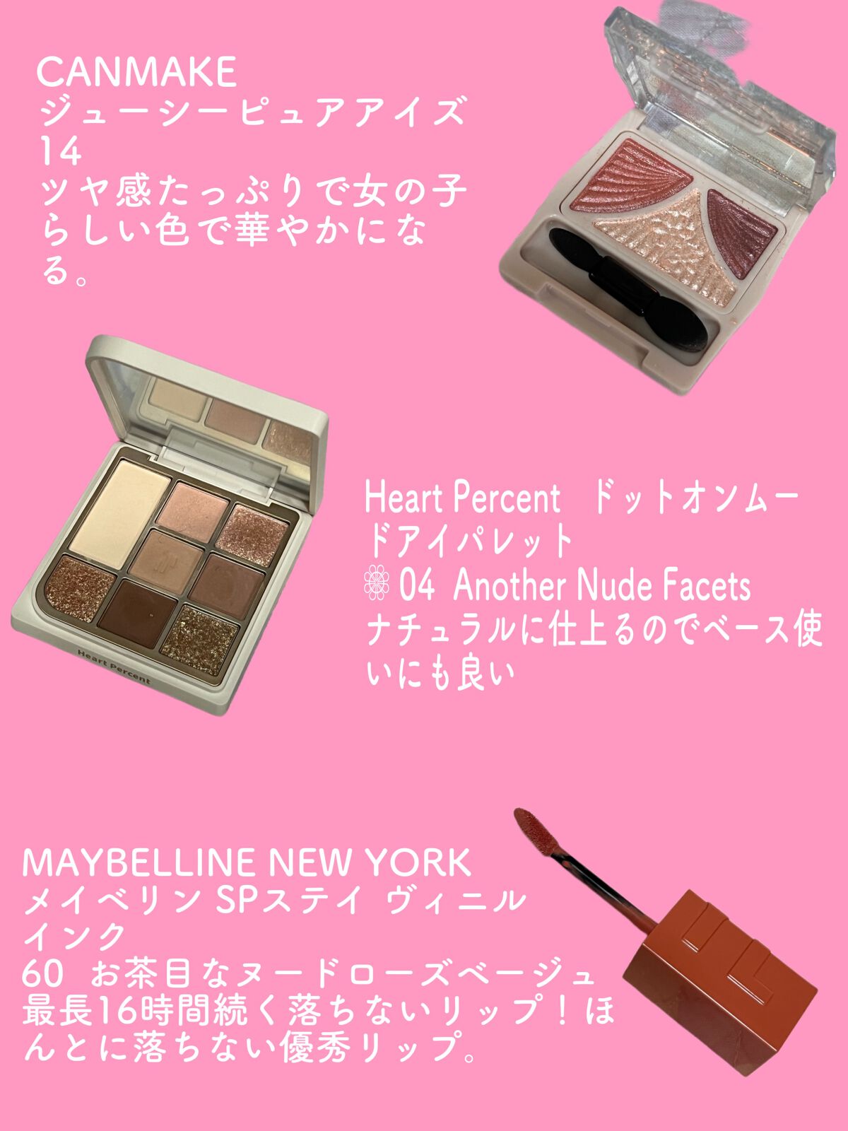 キャンメイクのジューシーピュアアイズ底見えだよ。 迷わず使えてかわいい色だから好き。 アイシャドウ ☆キャンメイク ジューシーピュアアイズ 14 テンダーフラワー アイライナー ☆キャンメイク ラスティングリキッドライナー 06 ローズグレージュ