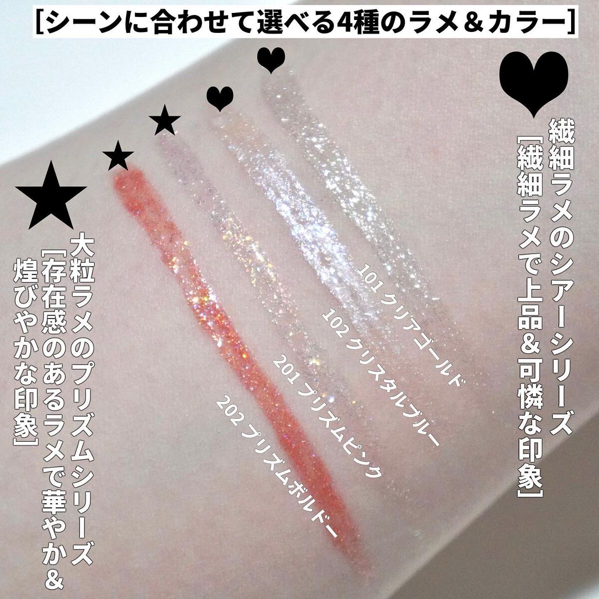 - 美容液うまれの、ラメライナー。シーンに合わせて選べるこだわりのラメ。細い筆タイプで、塗りやすさにもこだわりました。 美容成分配合で涙袋ぷっくり※1。スーパーヒアルロン酸※2、セラミド※3などの美容保湿成分を配合し、メイクしながら目元ケアを叶えます。塗った瞬間ピタっと密着するのにパリパリせず長時間ラメ感キープ。※1 お湯でするんと簡単にメイクオフが可能です。 ※1メイクアップ効果による ※2アセチルヒアルロン酸Na ※3グルコシルセラミド