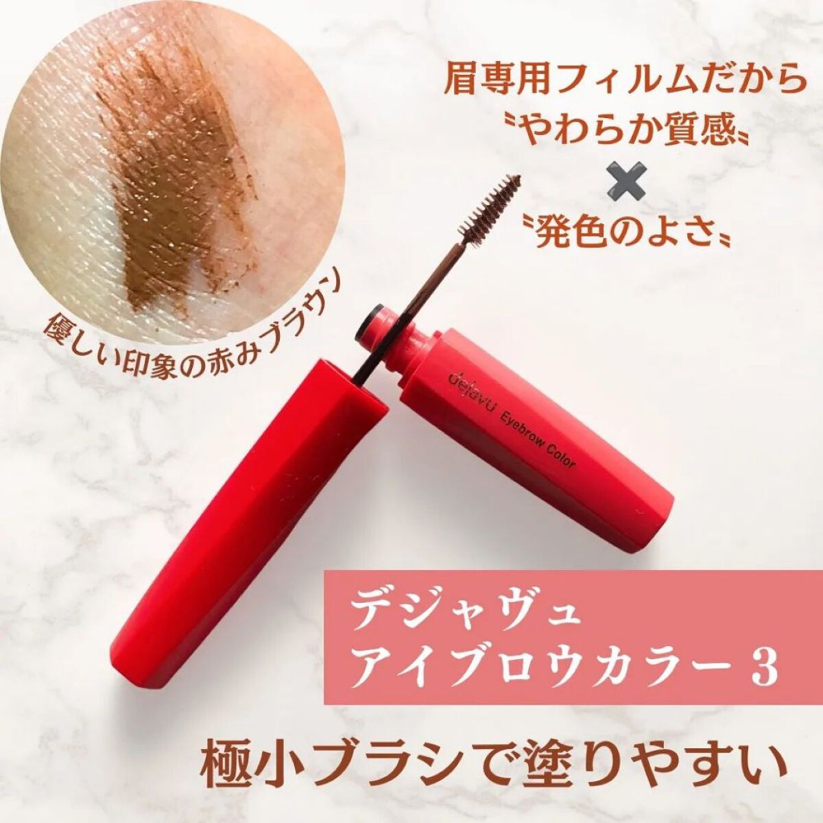 - \\25年3月定番新色モカグレージュ発売// 「フィルム眉カラー」なら眉の印象を自然にやわらげ、ふんわり質感の垢抜け眉に! 1.塗りやすい極小ブラシ ・ 先端直径3mmで、地肌に液がつきにくく根元から色づける ・余分な液がつかない設計で、ティッシュオフ不要 2.眉専用フィルム液 ・眉毛1本1本にキレイに色付き、自眉の黒さをやわらげる ・タバになったり、パリッと固まったりせず、まるで自眉のような仕上がり ・皮脂・汗・こすれに強いのにお湯で簡単オフ (※2025年9月以降、商品パッケージをリニューアル。) デジャヴュ アイブロウカラー