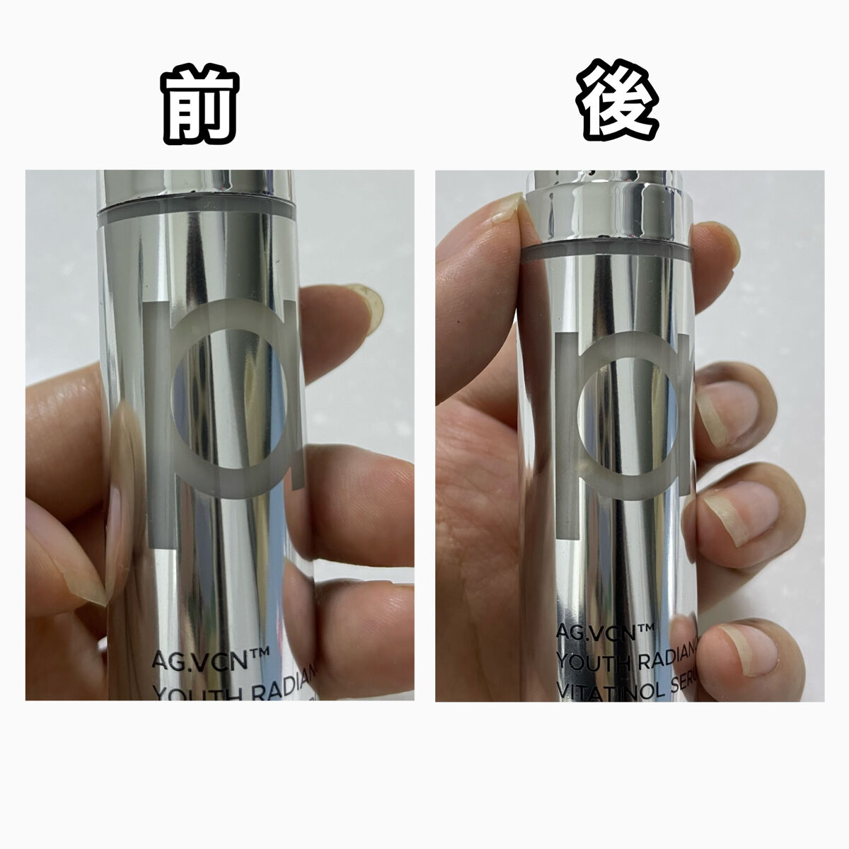 シルバーのボトルは、とってもオシャレ カプセルパートとセラムパートで分かれているのでふたを開け、カチッと音がするまでポンプを押し、最初に使用するときは、カプセルが溶けてセラムとよく混ざるように30秒以上、上下に振り、5分ほど立てておき、お肌になじませます。 ビタミンC+レチノールを実現したセラムはビタミンCカプセルとピュアレチノールの革新的な組み合わせで、毛穴や弾力などの肌の状態をケアし、健康的で美しい肌へと導くことができます。 やっぱり、別々に使ってたビタミンCとレチノールが一緒に使えるのはうれしい!