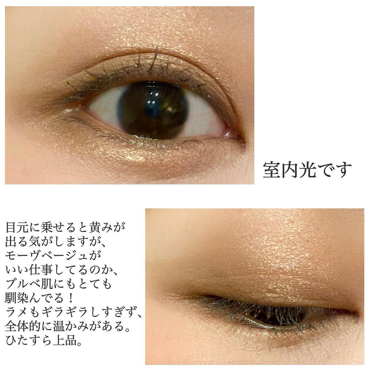 このパレットは、黄味が少なめでブルベにも使いやすいブラウン。 発色はしっかり目だけど、ブラシで調節も可能なので幅広い人に使いやすいパレットだと思います🎀✨ ラメ感も少しずつ異なり、華やかさを抑えたい時は右上を多めに使うと品の良いツヤのあるピンクブラウンメイクになります💎✨ 左上のラメカラーは白っぽいのでどんなアイシャドウとも相性抜群! この可愛い色味と煌びやかなラメは唯一無二です!