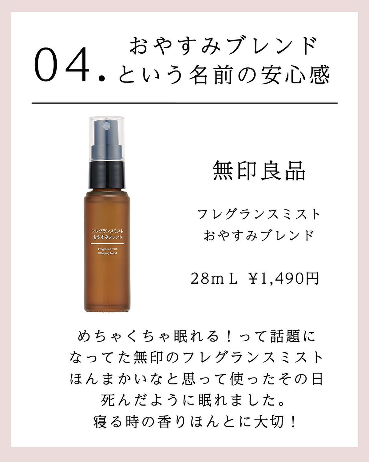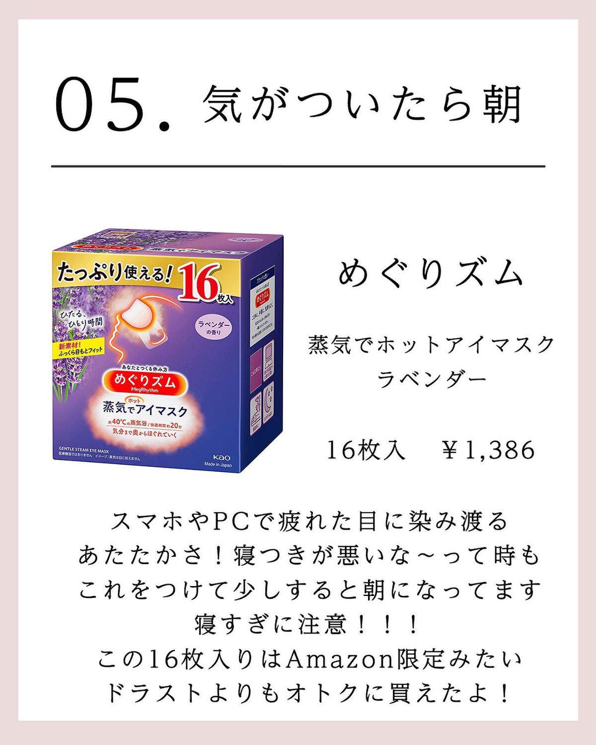 ザボディショップ ウェルネスバーミィボディクリーム ラベンダー&ベチバー 200ml¥4,290 小林製薬 ナイトミン耳ほぐタイム ¥706 めぐりズム じんわりスチーム足パック 6枚入 ¥480 無印良品 フレグランスミスト おやすみブレンド 28mL ¥1,490円 蒸気でホットアイマスク ラベンダー 16枚入 ¥1,386 Aesop イミディエイトモイスチャーフェイシャルイドロソール 50 mL ¥2,860 SeaMinerals ミネラルバスソルト ¥2,000 ゆたぽん 腰巻ホット温蒸気 ¥1,527