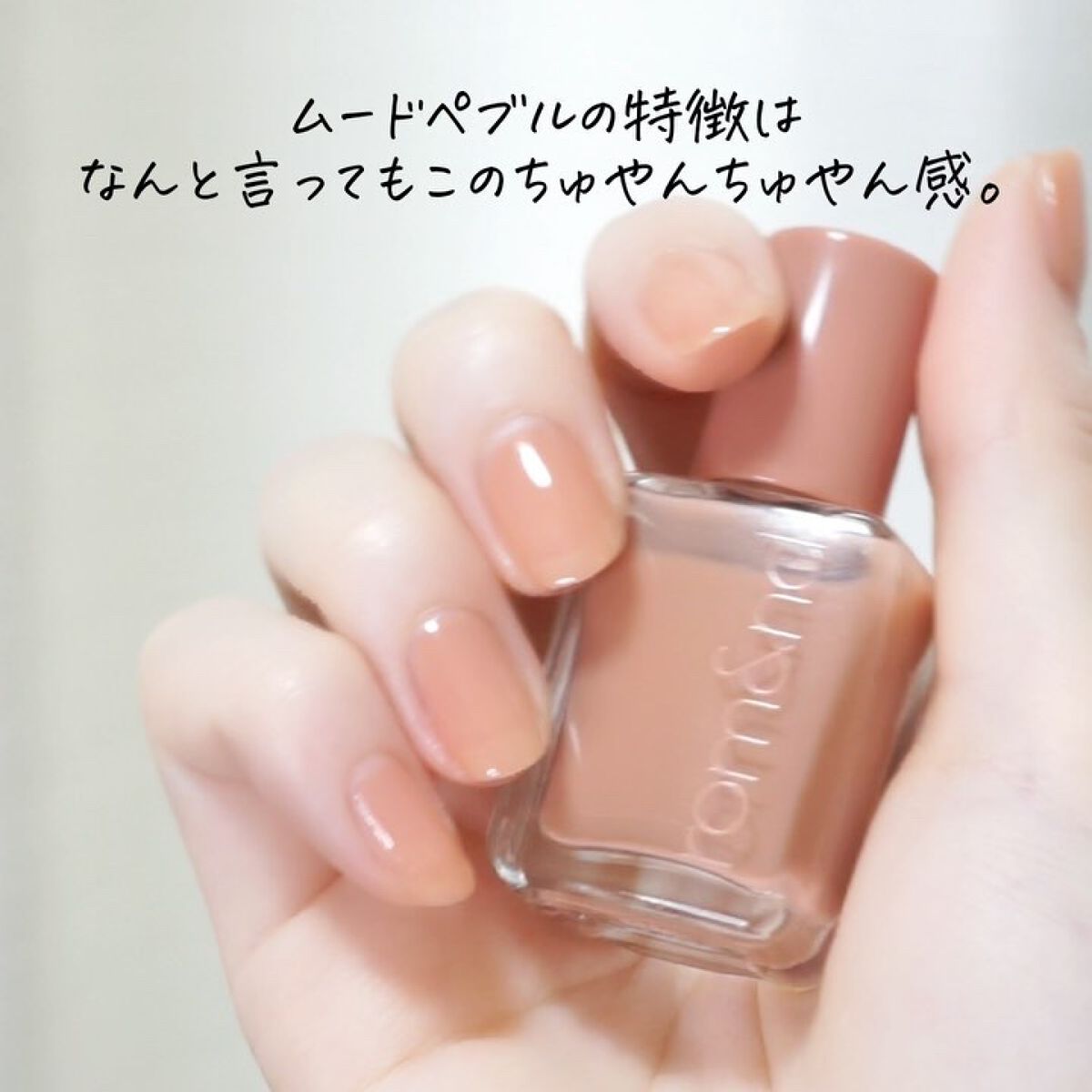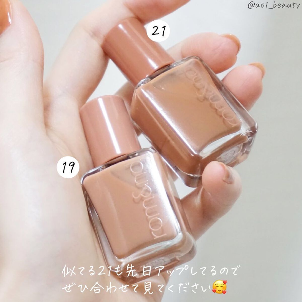 - 指先に玉石のような、ならかな光沢をとどめる。塗った瞬間から綺麗なツヤと光沢を維持し、重ねて塗っても透き通ったカラー感を鮮やかにとどめる、素早い乾燥力のナチュラルカラーネイル。「ロムアンド」の次世代型ネイルです。
