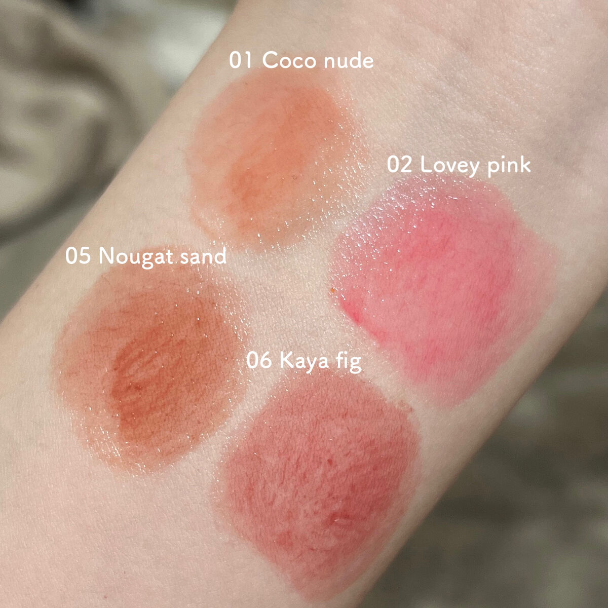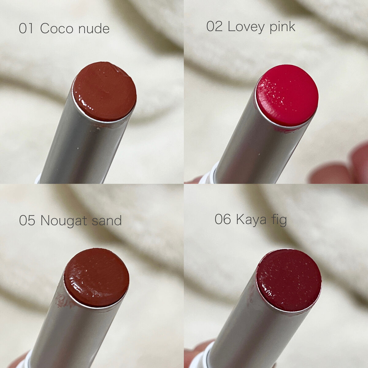- <01 ココヌード(Coco Nude)> リンゴ酸ジイソステアリル、ダイマージリノール酸ダイマージリノレイルビス(ベヘニル/イソステアリル/フィトステリル)、トリイソステアリン酸ポリグリセリル-2、ビスジグリセリルポリアシルアジペート-2、パラフィン、トリメリト酸トリトリデシル、テトライソステアリン酸ペンタエリスリチル、マイクロクリスタリンワックス、イソステアリン酸ソルビタン、1,2-ヘキサンジオール、ジステアルジモニウムヘクトライト、合成ワックス、酸化チタン、(エチレン/プロピレン)コポリマー、酸化鉄、炭酸プロピレン、香料、赤104(1)、リモネン、リナロール、ホホバ種子油、アーモンド油、アンズ核油、月見草油、オリーブ果実油、アルガニアスピノサ核油、シア脂、ツバキ種子油、トリ(カプリル/カプリン酸)グリセリル、マンゴー果実エキス、カニナバラ果実エキス <02 ラヴィーピンク(Lovey Pink)> リンゴ酸ジイソステアリル、ダイマージリノール酸ダイマージリノレイルビス(ベヘニル/イソステアリル/フィトステリル)、トリイソステアリン酸ポリグリセリル-2、ビスジグリセリルポリアシルアジペート-2、パラフィン、トリメリト酸トリトリデシル、テトライソステアリン酸ペンタエリスリチル、マイクロクリスタリンワックス、イソステアリン酸ソルビタン、1,2-ヘキサンジオール、ジステアルジモニウムヘクトライト、合成ワックス、酸化チタン、(エチレン/プロピレン)コポリマー、赤104(1)、黄5、炭酸プロピレン、赤202、香料、リモネン、リナロール、ホホバ種子油、アーモンド油、アンズ核油、月見草油、オリーブ果実油、アルガニアスピノサ核油、シア脂、ツバキ種子油、トリ(カプリル/カプリン酸)グリセリル、マンゴー果実エキス、カニナバラ果実エキス <03 ソルベバーム(Sorbet Balm)> リンゴ酸ジイソステアリル、ダイマージリノール酸ダイマージリノレイルビス(ベヘニル/イソステアリル/フィトステリル)、トリイソステアリン酸ポリグリセリル-2、ビスジグリセリルポリアシルアジペート-2、パラフィン、トリメリト酸トリトリデシル、テトライソステアリン酸ペンタエリスリチル、マイクロクリスタリンワックス、イソステアリン酸ソルビタン、1,2-ヘキサンジオール、ジステアルジモニウムヘクトライト、合成ワックス、酸化チタン、赤104(1)、(エチレン/プロピレン)コポリマー、酸化鉄、黄5、炭酸プロピレン、香料、リモネン、リナロール、アルガニアスピノサ核油、シア脂、ツバキ種子油、トリ(カプリル/カプリン酸)グリセリル、アーモンド油、アンズ核油、月見草油、オリーブ果実油、ホホバ種子油、マンゴー果実エキス、カニナバラ果実エキス <04 ヒッピーベリー(Hippie Berry)> リンゴ酸ジイソステアリル、ダイマージリノール酸ダイマージリノレイルビス(ベヘニル/イソステアリル/フィトステリル)、トリイソステアリン酸ポリグリセリル-2、ビスジグリセリルポリアシルアジペート-2、パラフィン、トリメリト酸トリトリデシル、テトライソステアリン酸ペンタエリスリチル、マイクロクリスタリンワックス、イソステアリン酸ソルビタン、1,2-ヘキサンジオール、ジステアルジモニウムヘクトライト、合成ワックス、赤104(1)、黄5、(エチレン/プロピレン)コポリマー、赤202、炭酸プロピレン、酸化鉄、酸化チタン、香料、リモネン、リナロール、ホホバ種子油、アーモンド油、アンズ核油、月見草油、オリーブ果実油、アルガニアスピノサ核油、シア脂、ツバキ種子油、トリ(カプリル/カプリン酸)グリセリル、カニナバラ果実エキス、マンゴー果実エキス <05 ヌガーサンド(Nougat Sand)> リンゴ酸ジイソステアリル、ダイマージリノール酸ダイマージリノレイルビス(ベヘニル/イソステアリル/フィトステリル)、トリイソステアリン酸ポリグリセリル-2、ビスジグリセリルポリアシルアジペート-2、パラフィン、トリメリト酸トリトリデシル、テトライソステアリン酸ペンタエリスリチル、マイクロクリスタリンワックス、イソステアリン酸ソルビタン、酸化チタン、1,2-ヘキサンジオール、ジステアルジモニウムヘクトライト、合成ワックス、黄4、(エチレン/プロピレン)コポリマー、酸化鉄、炭酸プロピレン、赤202、香料、リモネン、青1、リナロール、シア脂、ツバキ種子油、トリ(カプリル/カプリン酸)グリセリル、アルガニアスピノサ核油、ホホバ種子油、アーモンド油、アンズ核油、月見草油、オリーブ果実油、マンゴー果実エキス、カニナバラ果実エキス <06 カヤフィグ(Kaya Fig)> リンゴ酸ジイソステアリル、ダイマージリノール酸ダイマージリノレイルビス(ベヘニル/イソステアリル/フィトステリル)、トリイソステアリン酸ポリグリセリル-2、ビスジグリセリルポリアシルアジペート-2、パラフィン、トリメリト酸トリトリデシル、テトライソステアリン酸ペンタエリスリチル、マイクロクリスタリンワックス、イソステアリン酸ソルビタン、1,2-ヘキサンジオール、酸化チタン、ジステアルジモニウムヘク