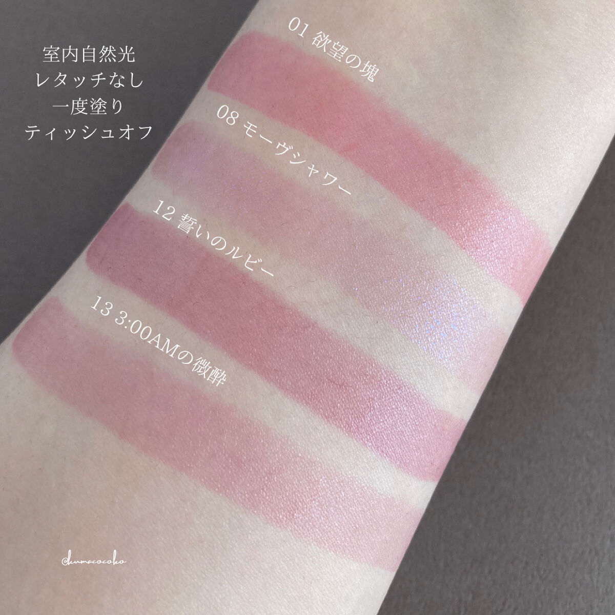 KATEリップモンスター ¥1,54008 モーブシャワー青み強めのピンクに青ラメ。ちょっとザリザリする。12 誓いのルビープラムっぽい、やや暗めのレッド。でも暗すぎないので普段使いしやすい。13 3:00AMの微酔モーヴシャワーほどではない...