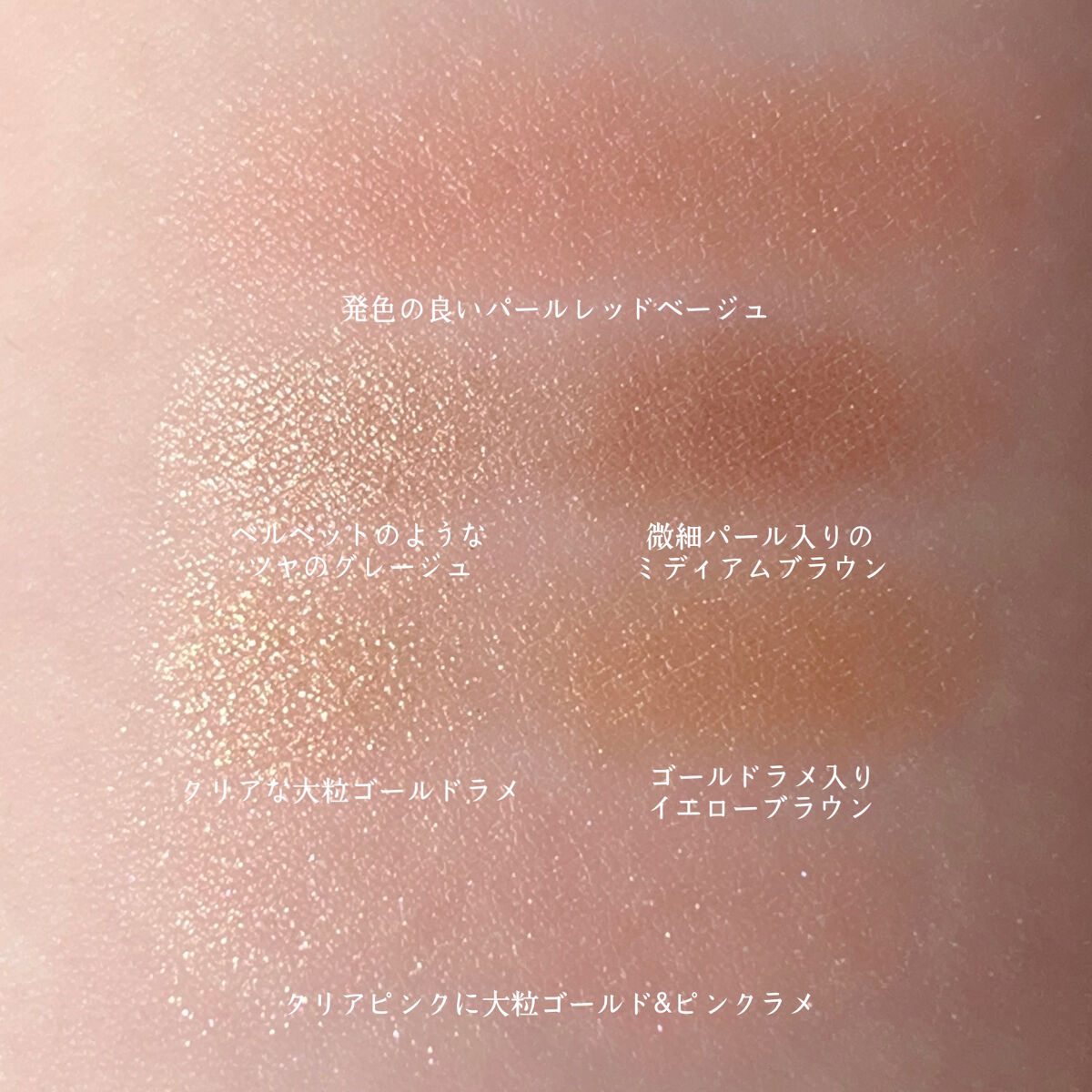 繊細なシルバーラメから大粒の多色グリッターまで多種多様な輝きがホリデーらしくて気分が上がる。 個人的には偏光ピンクラメ+多色のグリッターの左下シャンパンキャンドルがかわいいもの同士の組み合わせでお気に入り。 スノーマン 、ピンクエンジェル、シュトーレンとクリスマスに因んだ色名もかわいい🕯️ 底色はほぼないので他のアイシャドウで陰影のベースを作った後にトッピングとして乗せるのがおすすめ。 公式でおすすめされている16 バイオレットニットとの組み合わせが冬ムードたっぷりで真似してみたい🤍